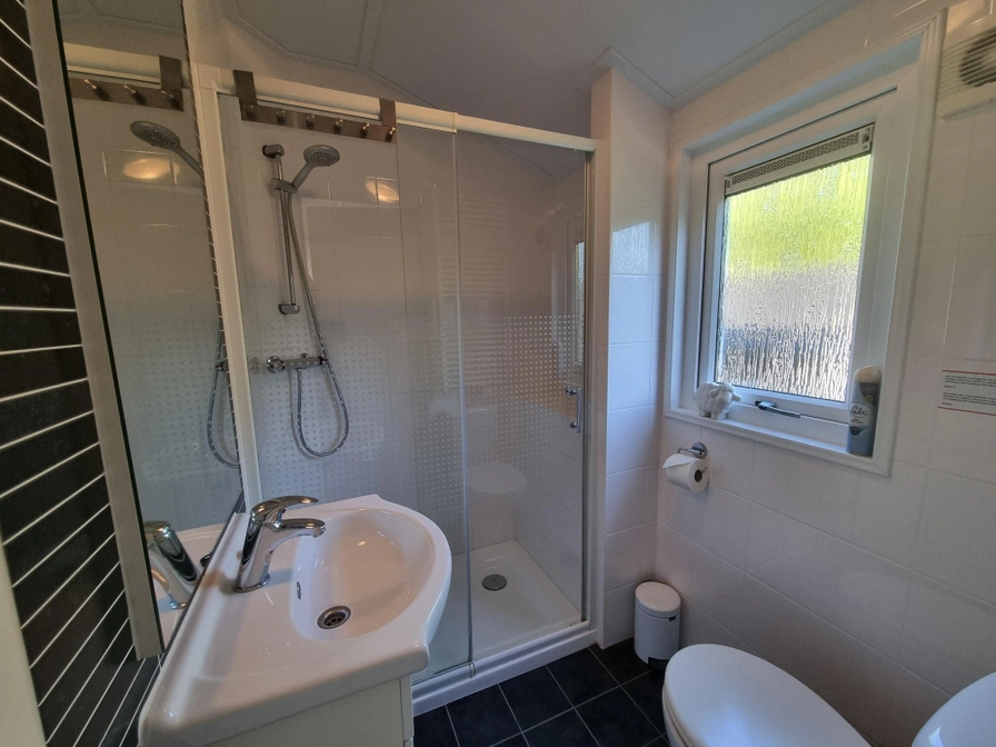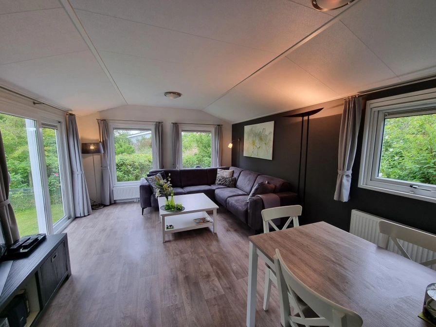 Eingang, Wohnzimmer mit Sitzecke, TV und DVD-Player. Offene Küche mit Gasherd, Kombimikrowelle, Kühlschrank mit Gefrierfach, Kaffeemaschine und Wasserkocher. Badezimmer mit Dusche und WC. Schlafzimmer mit einem Doppelbett (mit 2 Matratzen und 2 Bettdecken). Zweites Schlafzimmer mit 1 Einzelbett und einem Etagenbett. Großer Garten und Terrasse von 20 m2 mit Gartenmöbeln.