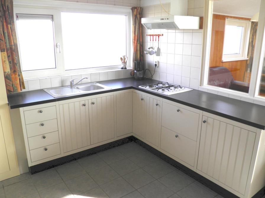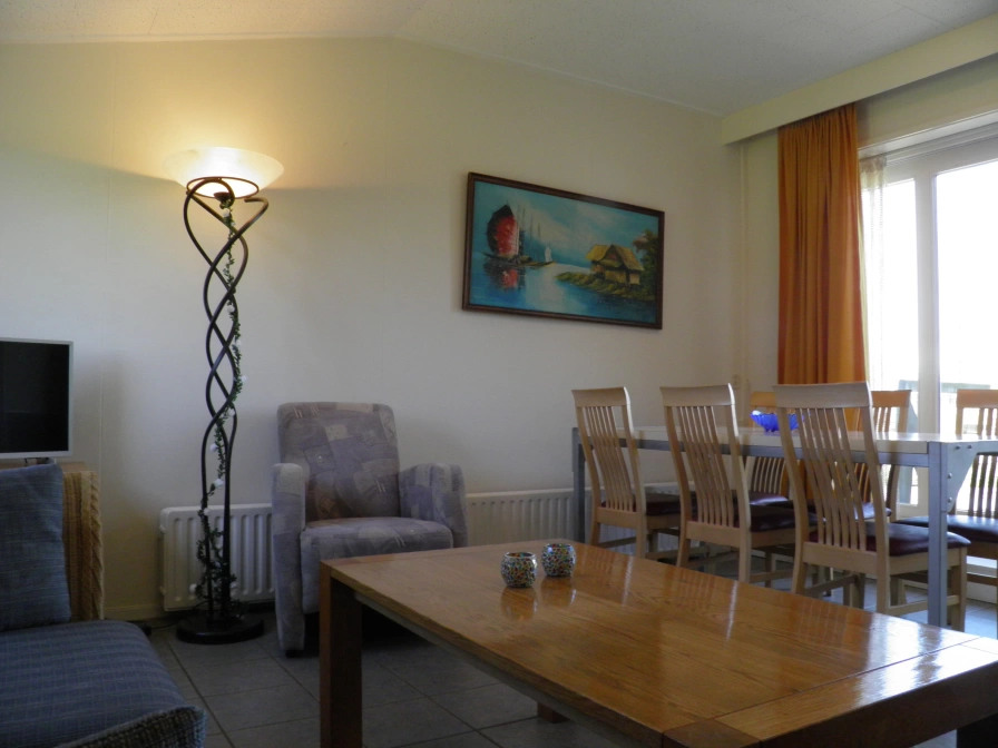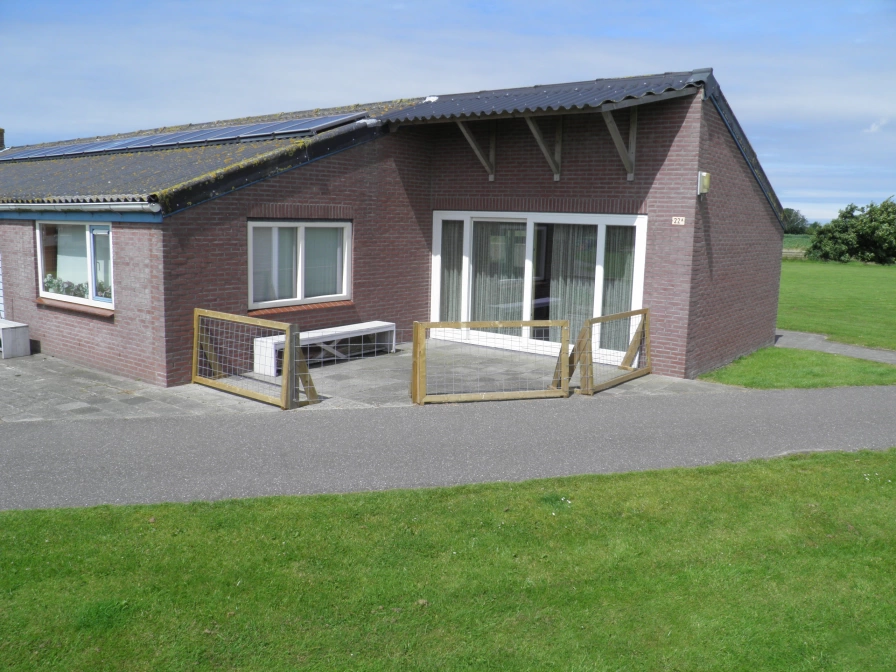 Doppelhaushälfte im Erdgeschoss - für maximal 6 Personen. Halle, separate Küche (Kühlschrank mit Gefrierfach und Mikrowelle, Kaffeemaschine). Geräumiges und sonniges Wohnzimmer mit Sitz- und Essbereich und Schiebetüren zur eingezäunten Terrasse. Es gibt drei Schlafzimmer (2-2-2) mit Waschbecken und jeweils 2x Einzelbetten. Badezimmer mit Fußbodenheizung mit Dusche, separates WC. Satellitenfernsehen, Zentralheizung und komplett gefliest. Dieses Ferienhaus verfügt über 2 geschlossene Terrassen mit Gartenmöbeln und liegt in der Nähe des Hunderennfeldes mit Hindernisparcours.