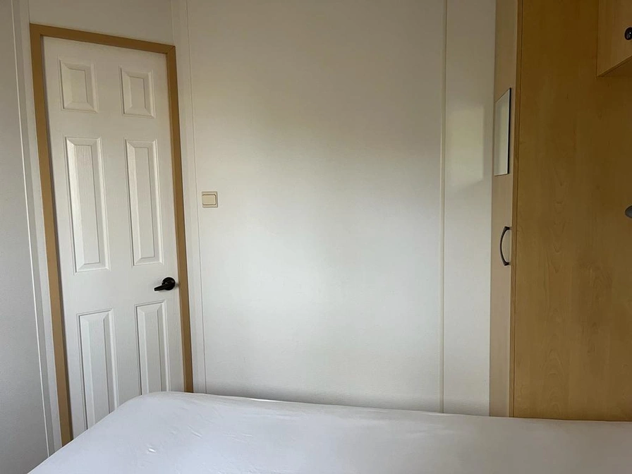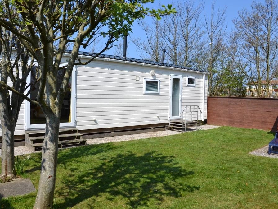 Geeignet für vier Personen. Es gibt zwei Schlafzimmer und ein Badezimmer mit Dusche, Waschbecken und Toilette. Die offene Küche grenzt an das Wohnzimmer. Dieses Chalet hat einen geräumigen Eckplatz und einen Garten von 140 Quadratmetern.