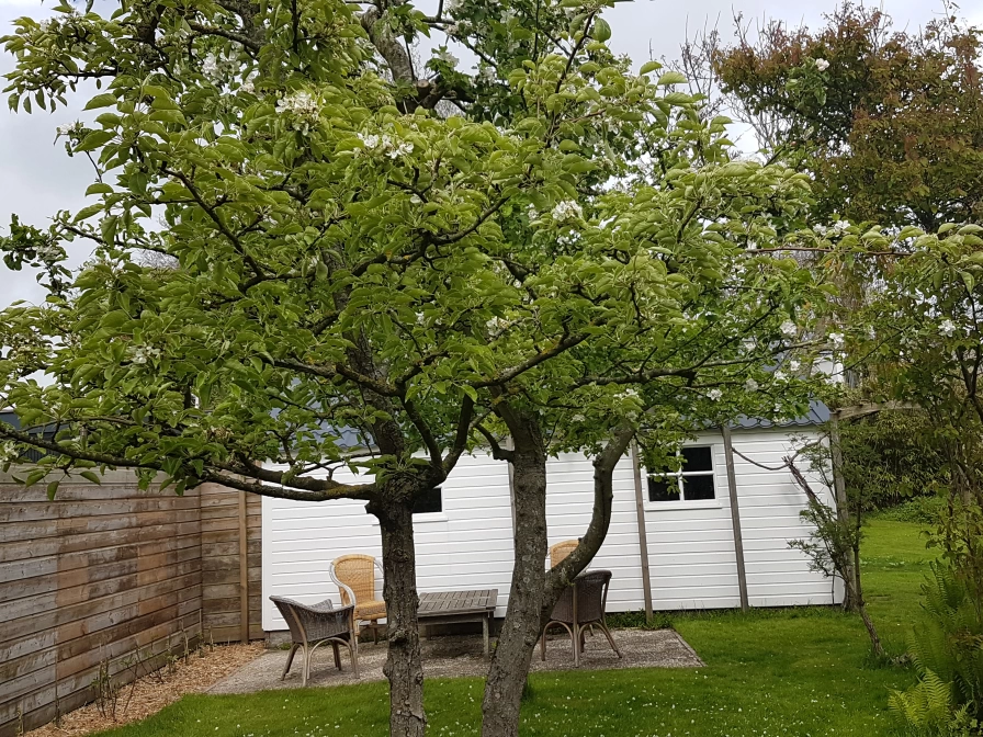 Eingang, Zimmer mit 1 Doppelbett, Smart-TV, Mikrowelle, Kühlschrank, Wasserkocher, Geschirr und Einrichtungen für die Zubereitung von Kaffee und Tee. Privates Badezimmer mit ebenerdiger Dusche und Waschbecken. Eigene Toilette in einem separaten Raum daneben. Sie haben Zugang zu einer sonnigen, geschützten Terrasse mit Gartenmöbeln im Obstgarten.