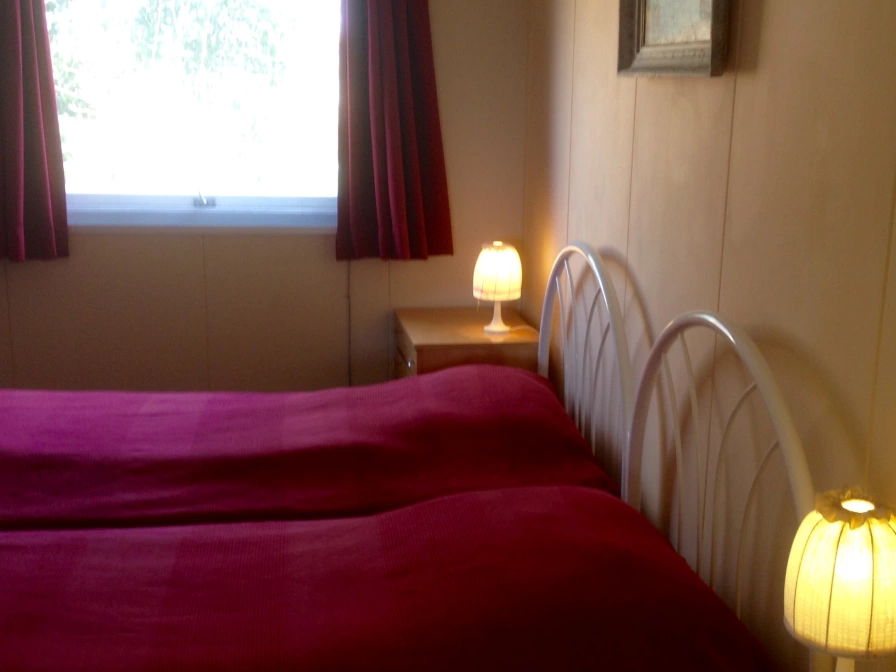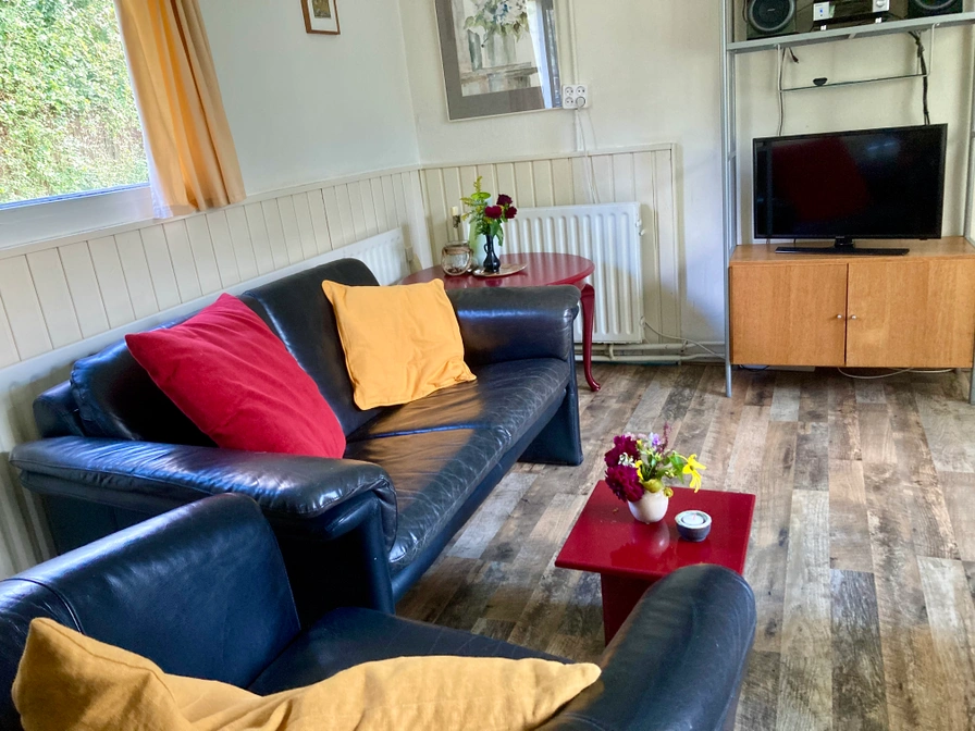 Das Wohnzimmer verfügt über eine Sitzecke mit TV und Stereoanlage. Es gibt auch einen Essbereich. Die offene Küche ist mit einem Kühlschrank mit Gefrierfach und Mikrowelle ausgestattet. Es gibt ein Schlafzimmer mit zwei Einzelbetten. Das Badezimmer verfügt über eine Dusche, ein Waschbecken und eine Toilette. Dieser Bungalow hat einen geschützten Garten im Süden.