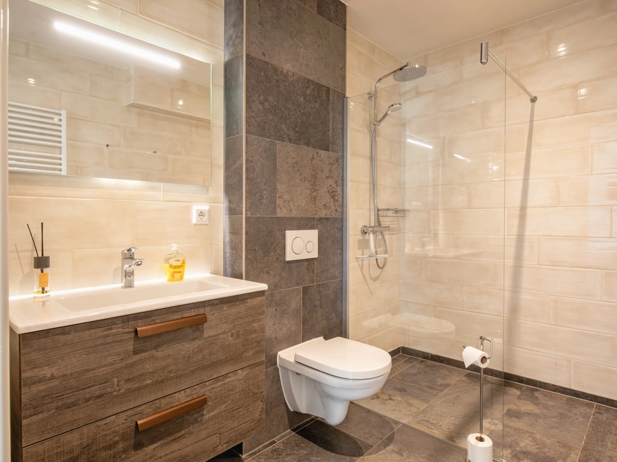 Diese geräumige Wohnung mit eigenem Eingang und Westterrasse befindet sich im Erdgeschoss. Eingang durch Flur mit Garderobe und Spiegel. Wohnzimmer mit großem Esstisch und schöner Sitzecke neben dem Smart-TV. Offene Küche im Landhausstil mit Spülmaschine, Herd, Kombi-Mikrowelle, geräumigem Kühlschrank mit Gefrierfach, Wasserkocher, Filterkaffeemaschine sowie einer Nespresso-Maschine und schönem Bunzlauer Schlossgeschirr. Schlafzimmer mit Luxusbett (180 x 200 cm), Kleiderschrank, Nachttischen und zweitem Smart-TV. Sehr geräumiges Badezimmer mit Regendusche und normaler Dusche, Toilette und Waschbecken mit zwei geräumigen Schubladen für Ihre Toilettenartikel. Badetücher und Küchentücher inklusive! Sie können auch den nach Süden ausgerichteten Garten nutzen. Auf Ihrer Terrasse stehen Ihnen zwei Relaxsessel mit dicken Kissen und ein Tisch zur Verfügung. Die Terrasse ist vom Wohnzimmer durch die Terrassentüren (mit Moskitonetzen) zugänglich.