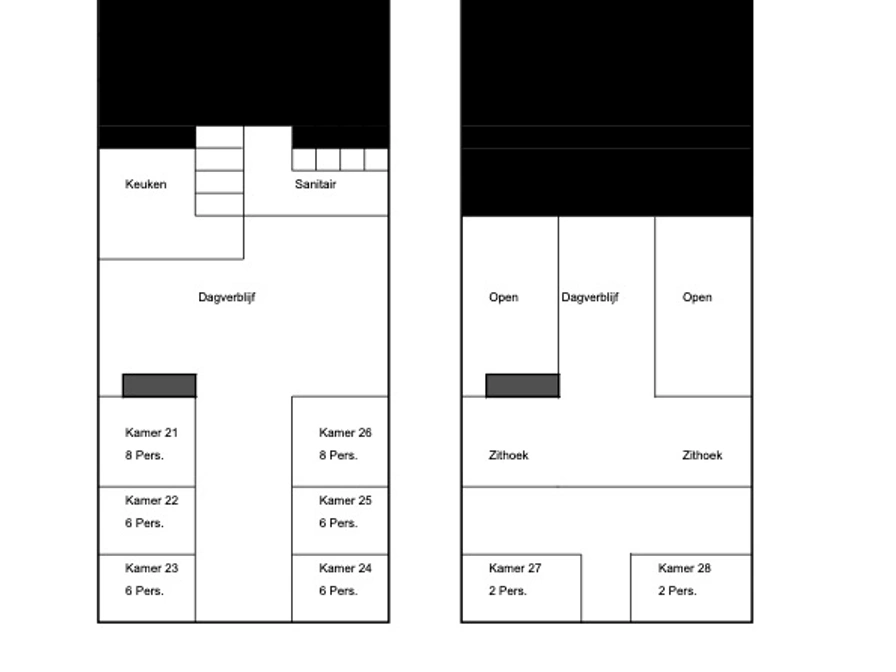 Gruppenunterkunft 'De Stolp II auf der rechten Seite ist für maximal 44 Personen geeignet. Eingang durch großes Esszimmer mit Tischen und Stühlen und TV. Separate, professionell ausgestattete Küche mit zwei Kühlschränken (2 x 406 Liter), einem Gefrierschrank (348 Liter), 6 großen Kochfeldern, Gasherd, Mikrowelle, Kaffeemaschine, Senseo-Kaffeemaschine, Wasserkocher und Geschirrspüler. Es gibt viele Pfannen, Töpfe, Schalen, Wasserkocher, Geschirr und Besteck. Es gibt zwei Schlafzimmer mit jeweils 4 Etagenbetten und vier Schlafzimmer mit jeweils 3 Etagenbetten. Im ersten Stock befinden sich zwei Schlafzimmer mit jeweils 2 Einzelbetten. Der Sanitärraum verfügt über 4 Toiletten, 4 Duschen (mit Thermostat) und 7 Waschbecken. Vor dem Haus befindet sich eine große Terrasse.