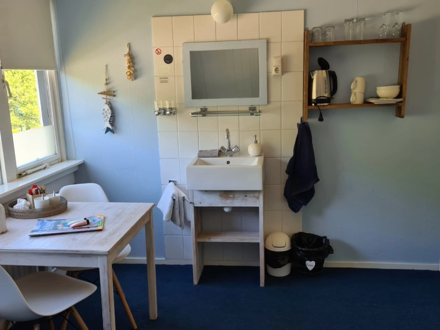 Das Zimmer im Obergeschoss verfügt über zwei Einzelbetten, einen TV und einen Essbereich. Ein Kühlschrank mit Gefrierfach und Wasserkocher ist vorhanden. Es gibt ein Waschbecken im Zimmer. Das Gemeinschaftsbad verfügt über eine Dusche und ein WC.