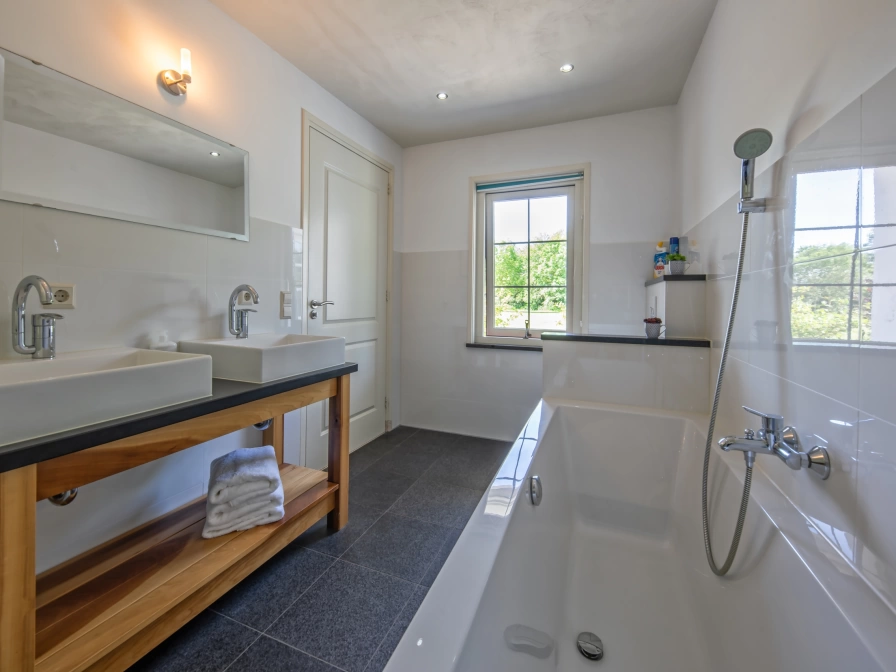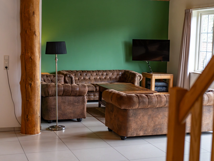 Das Wohnzimmer dieses Ferienhauses verfügt über eine Sitzecke mit gestimmtem Klavier, Fernseher mit Google Cromecast, Bluetooth-Box und Essbereich. Die offene Küche ist mit einem 5-Flammen-Herd, einer Kombi-Mikrowelle und einem Geschirrspüler ausgestattet. Im Erdgeschoss befinden sich zwei Schlafzimmer mit 2 Einzel-Boxspringbetten, auf Wunsch kann ein Hoch-Tief-Einzelbett hinzugefügt werden. Das Badezimmer verfügt über ein rollstuhlgerechtes Waschbecken, eine Dusche mit Duschsitz und eine Toilette mit Haltegriffen. Es gibt ein zweites Badezimmer mit Dusche und Badewanne. Im Obergeschoss befinden sich zwei weitere Schlafzimmer mit jeweils 2 Einzel-Boxspringbetten. Dieses Ferienhaus verfügt über eine große Terrasse mit Gartenmöbeln und eine große Liegewiese mit Kinderspielgeräten.