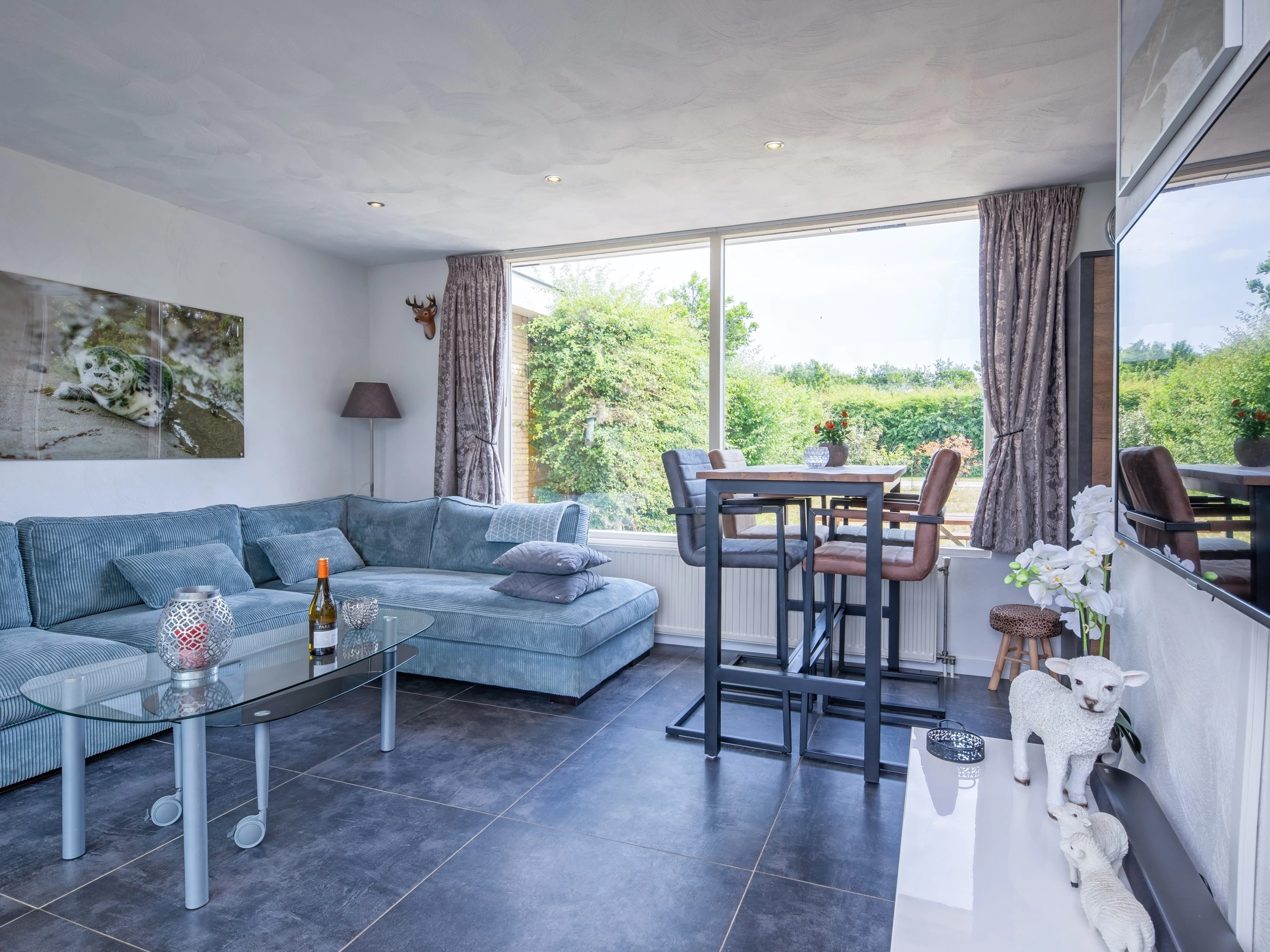 Das Wohnzimmer des Doppelhaus-Bungalows Duin aan Zee verfügt über eine Sitzecke mit einem Smart-TV mit Soundbar. Es gibt auch einen Essbereich. Die Küche ist mit Kühlschrank, Mikrowelle, Nespresso, Senseo, elektrischer Orangenpresse, Toaster, Eierkocher, Sandwichmaker und Geschirrspüler ausgestattet. Beide Schlafzimmer verfügen über Boxspringbetten, getrennte Matratzen und Einzelbettdecken. Eines der Schlafzimmer hat: Smart-TV, Waschbecken und Badewanne. Es gibt ein zweites Badezimmer mit Dusche und WC. Schiebetüren vom Wohnzimmer führen zu einer Terrasse mit beleuchtetem Dach auf der Rückseite des Hauses. Dieser Bungalow verfügt über einen großen Garten mit Terrasse. Es gibt ein luxuriöses Lounge-Set mit Kissen.
