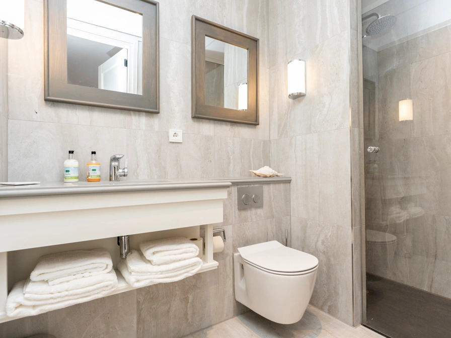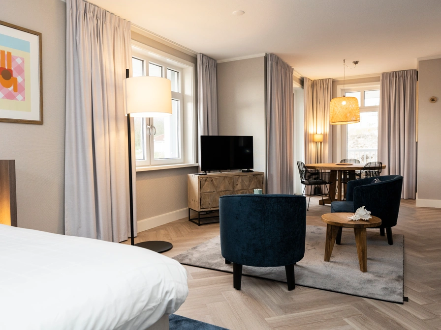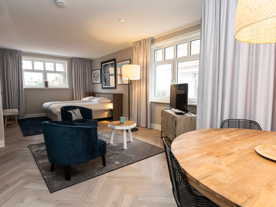 Geräumige Suite für 2 Personen im ersten Stock mit Balkon und eigenem Bad. Mit einem schönen Kingsize-Boxspringbett (180x205), einer gemütlichen Sitzecke und einem Essbereich. Mit der Klimaanlage und der Fußbodenheizung können Sie das Klima im Raum selbst regulieren. Diese Suite verfügt über einen Balkon (ohne Sitzmöbel). Die Suiten sind hundefrei und nicht für Kinder oder Babys geeignet. Die Haustür, das Treppenhaus und die Veranda vor dem Haus teilen Sie mit den ständigen Bewohnern. Darüber hinaus gibt es keine Gemeinschaftsbereiche.