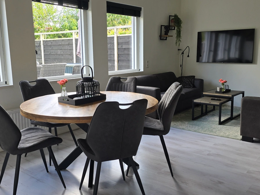 Das Wohnzimmer verfügt über eine Sitzecke mit großem LED-TV, Radio und einer Essecke. Die offene Küche ist mit einem Induktionskochfeld, einem Kühlschrank mit Gefrierfach, einem Kombibackofen, einem Geschirrspüler und Senseo ausgestattet. Im Erdgeschoss befindet sich ein geräumiges Schlafzimmer mit elektrischem Boxspringbett von 180 x 210 und TV. Das Badezimmer verfügt über eine Regendusche, Badewanne, Waschbecken und Toilette. Im ersten Stock befinden sich zwei Schlafzimmer, eines mit zwei Einzelbetten von 90 x 200 und einem Fernseher sowie Schiebetüren zu einer Balustrade. Das andere Schlafzimmer verfügt über ein Bett von 150 x 200 und einen Fernseher. Das Badezimmer verfügt über eine Dusche, ein Doppelwaschbecken, eine Duschkabine, eine Toilette und eine Infrarotsauna. Dieses Ferienhaus verfügt über einen großen, uneinsehbaren Garten mit Terrasse und freiem Blick.