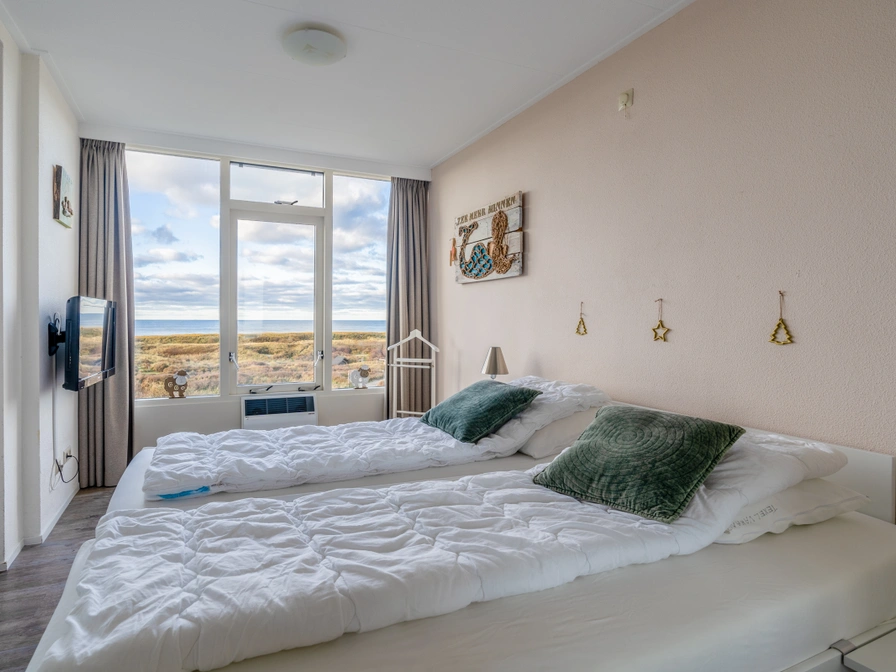 Geräumiges Apartment für 2 Personen im ersten Stock. Das geräumige Wohnzimmer verfügt über einen Fernseher und einen elektrischen Kamin. Die gepflegte offene Küche ist komplett ausgestattet, inklusive Geschirrspüler, Kombi-Mikrowelle, Kühl-Gefrierkombination und diversen Kaffeemaschinen. Außerdem gibt es einen Essbereich mit einem Esstisch für 4 Personen. Es gibt ein Schlafzimmer mit einem Doppelbett mit zwei Einzelmatratzen und auch einen Fernseher. Das geräumige Badezimmer verfügt über eine Dusche, eine Badewanne, eine Toilette und ein Doppelwaschbecken. Balkon mit Blick auf die Dünen und die Nordsee, Gartenmöbel sind vorhanden.