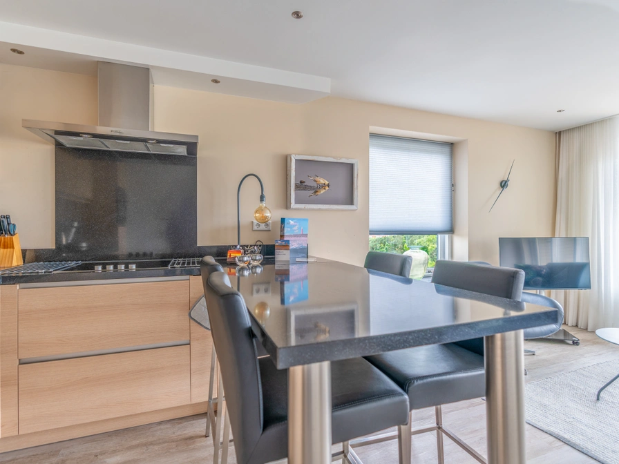 Luxuriöse Eckwohnung im Erdgeschoss mit großzügiger Südterrasse. Eingang, geräumiges Wohnzimmer mit Sitzecke und Smart-TV. Die offene Küche ist komplett ausgestattet, unter anderem mit Geschirrspüler, Kombi-Mikrowelle, Kühl-Gefrierkombination, diversen Kaffeemaschinen und einem Essbereich mit Esstisch für 4 Personen. Es gibt zwei Schlafzimmer, beide mit zwei Boxspring-Einzelbetten. Das gepflegte Badezimmer verfügt über eine Dusche und ein Doppelwaschbecken. Die Toilette befindet sich separat. Von der großzügigen Terrasse aus haben Sie einen Blick über den Badeort De Koog, den Badweg und die Dünen. Die Terrasse ist mit Gartenmöbeln ausgestattet.
