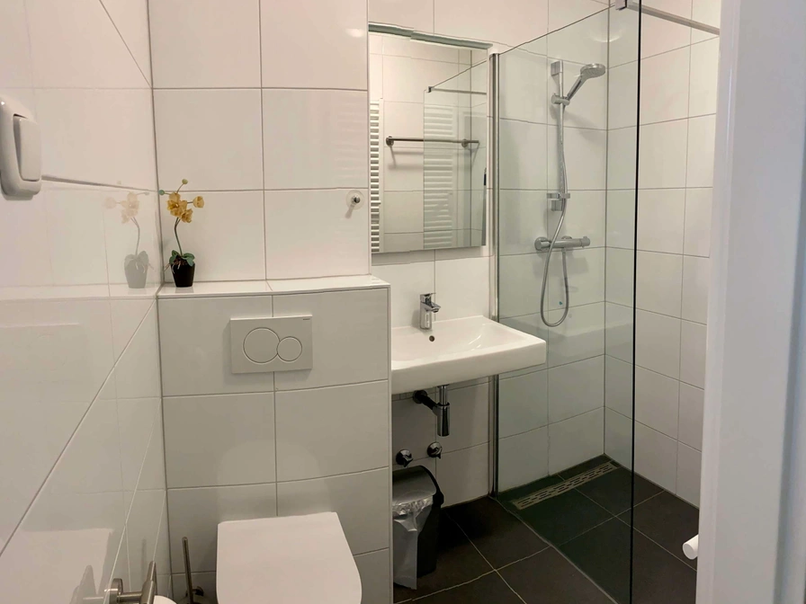 Diese gepflegte Wohnung befindet sich im ersten Stock des Wohnhauses auf der Gartenseite. Das Wohnzimmer verfügt über eine Sitzecke mit TV. Die offene Küche ist mit einem Kühlschrank, einem 4-Flammen-Gasherd, einer kombinierten Mikrowelle, einer Kaffeemaschine und einem Essbereich ausgestattet. Das Schlafzimmer hat zwei Einzelbetten. Das Badezimmer verfügt über eine Dusche, ein Waschbecken und eine Toilette. Diese Wohnung verfügt über eine Terrasse auf der Westseite.