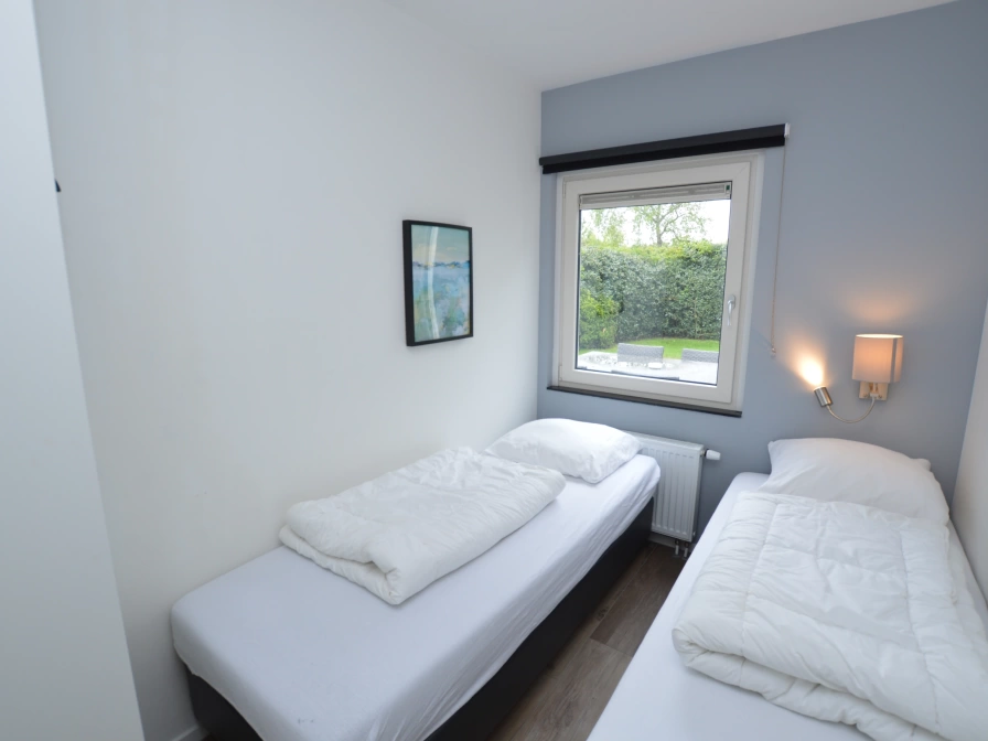 Das Wohnzimmer dieses freistehenden Bungalows verfügt über einen Essbereich und eine Sitzecke mit Kamin, TV und Stereoanlage. Die offene Küche ist mit einem Kühlschrank, einer kombinierten Mikrowelle und einem Geschirrspüler ausgestattet. Es gibt drei Schlafzimmer mit jeweils 2 Einzel-Boxspring-Betten (6 x Einzelbettdecken). Das Badezimmer hat eine Dusche mit Waschbecken, die Toilette ist separat. Dieser Bungalow verfügt über einen Garten mit einer geschützten Terrasse. Gartenmöbel sind vorhanden.