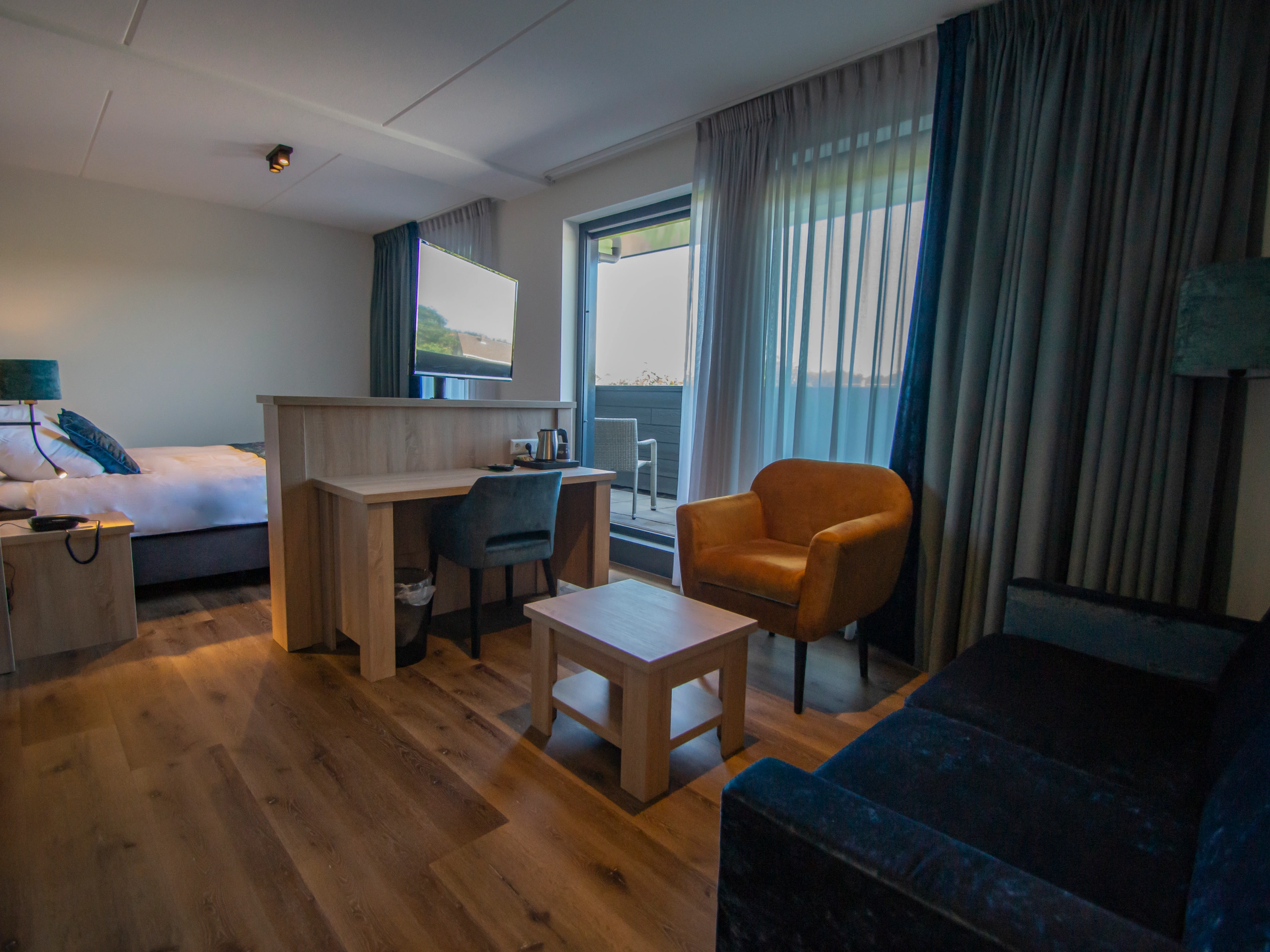 Juniorsuiten mit Balkon von 32 m2 mit Balkon sind mit einem Kingsize-Bett und einem Schlafsofa ausgestattet. Das Zimmer ist mit einem Raumteiler ausgestattet, wodurch das Zimmer in zwei Bereiche mit schöner Sitzecke, Kaffee-/Teekocher, LED-TV, Telefon mit Weckdienst, Wecker, Schreibtisch/Schminktisch, Safe unterteilt wird. Geräumiges Badezimmer mit Dusche und WC. Die Zimmer sind mit dem Aufzug erreichbar.