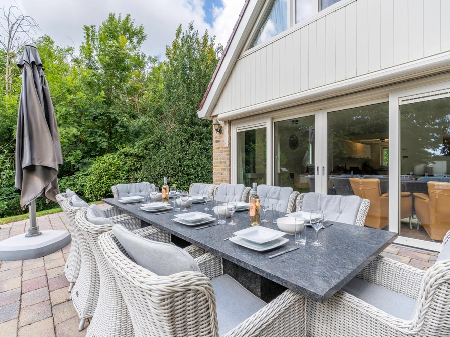 Das Wohnzimmer verfügt über eine Sitzecke mit Gaskamin, LED-Fernseher, DVD-Player und Radio/CD-Player. Die offene Küche ist mit Geschirrspüler, Heißluftofen, Kaffeemaschine, Senseo, Zitruspresse, Frühstücksbar und Essbereich ausgestattet. Im Hauswirtschaftsraum befinden sich eine Waschmaschine und ein Trockner. Im Obergeschoss befinden sich zwei Schlafzimmer mit jeweils zwei Einzel-Boxspringbetten. Das Badezimmer hat eine ebenerdige Dusche, ein Waschbecken und eine Toilette. Im Untergeschoss befindet sich das dritte Schlafzimmer mit einem Boxspringbett und Fernseher. Eine Glaswand sorgt für ausreichend Tageslicht. Das zweite Badezimmer hat eine Doppelbadewanne, eine ebenerdige Dusche und eine Toilette. Het Oude Dijkje hat einen großen, windgeschützten Garten mit mehreren Terrassen. Der Garten ist teilweise von einem Zaun und einem Wasserlauf umgeben. Gartenmöbel sind vorhanden.