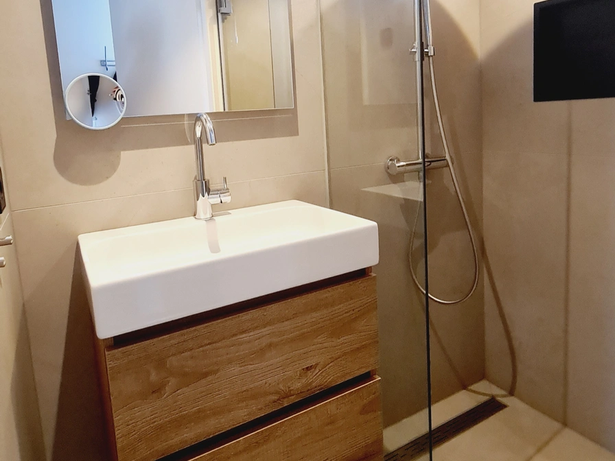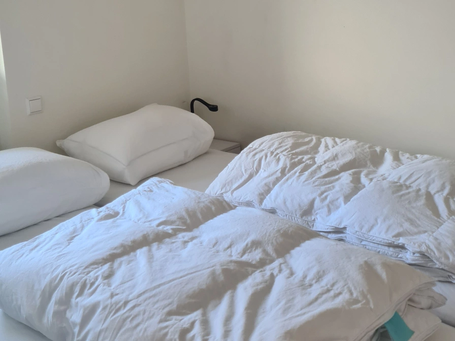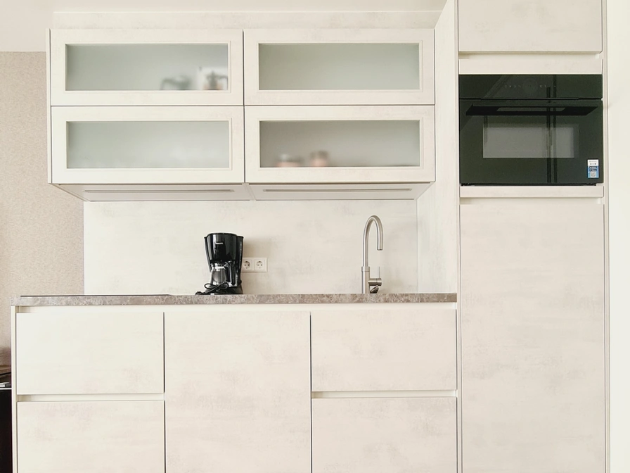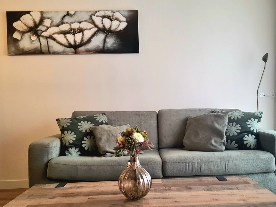 Wohnung im ersten Stock. Wohnzimmer mit Sitzecke, Essbereich und Smart-TV. Voll ausgestattete offene Küche mit Quooker-Wasserhahn, Mikrowellen-Kombigerät, Geschirrspüler, Kaffeemaschine, Wasserkocher, Toaster und Kühlschrank mit Gefrierfach. Schlafzimmer mit zwei Einzelbetten (Boxspringbetten) und großen Kleiderschränken. Badezimmer mit Dusche und separatem WC. Sonniger Balkon mit Sitzgelegenheit. Waschmaschine und Trockner befinden sich zentral im Gebäude.