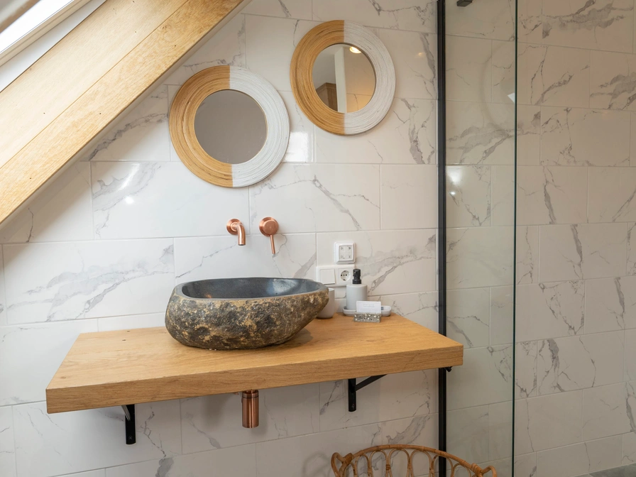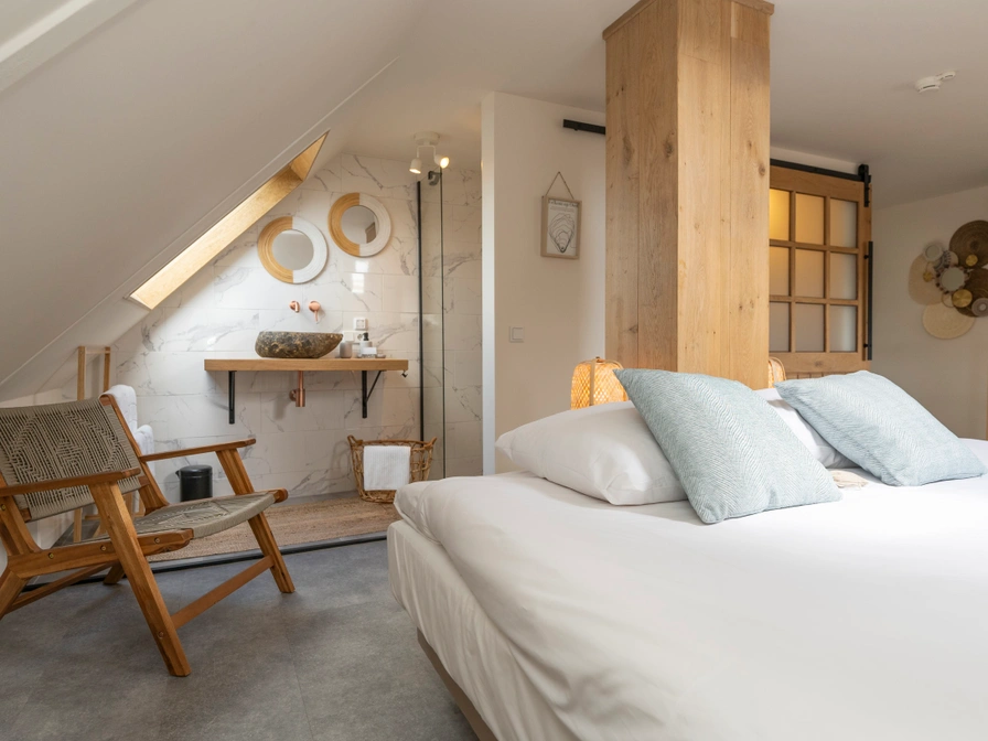 Die luxuriösen Farm Suiten befinden sich im ersten Stock auf der Ost- und Westseite der Farm und bieten Blick auf die Landschaft, den authentischen Osten und das Wattenmeer. Die Details im Raum enthüllen die Geschichte der Farm. Durch den Eingang betreten Sie den geräumigen Raum mit einem Doppelbett (160 x 200 cm). Badezimmer mit ebenerdiger Dusche, Waschbecken und separater Toilette. Es gibt einen Smart-TV (32 Zoll), einen offenen Schrank, eine Minibar mit einem lokalen und bewussten Sortiment, einen Wasserkocher, eine langsame Kaffeemaschine und verschiedene Teespezialitäten. Rund um den Hof gibt es einen großen Garten mit Terrassen, auf denen Sie als Gast entspannen können.