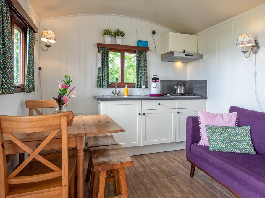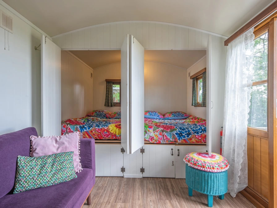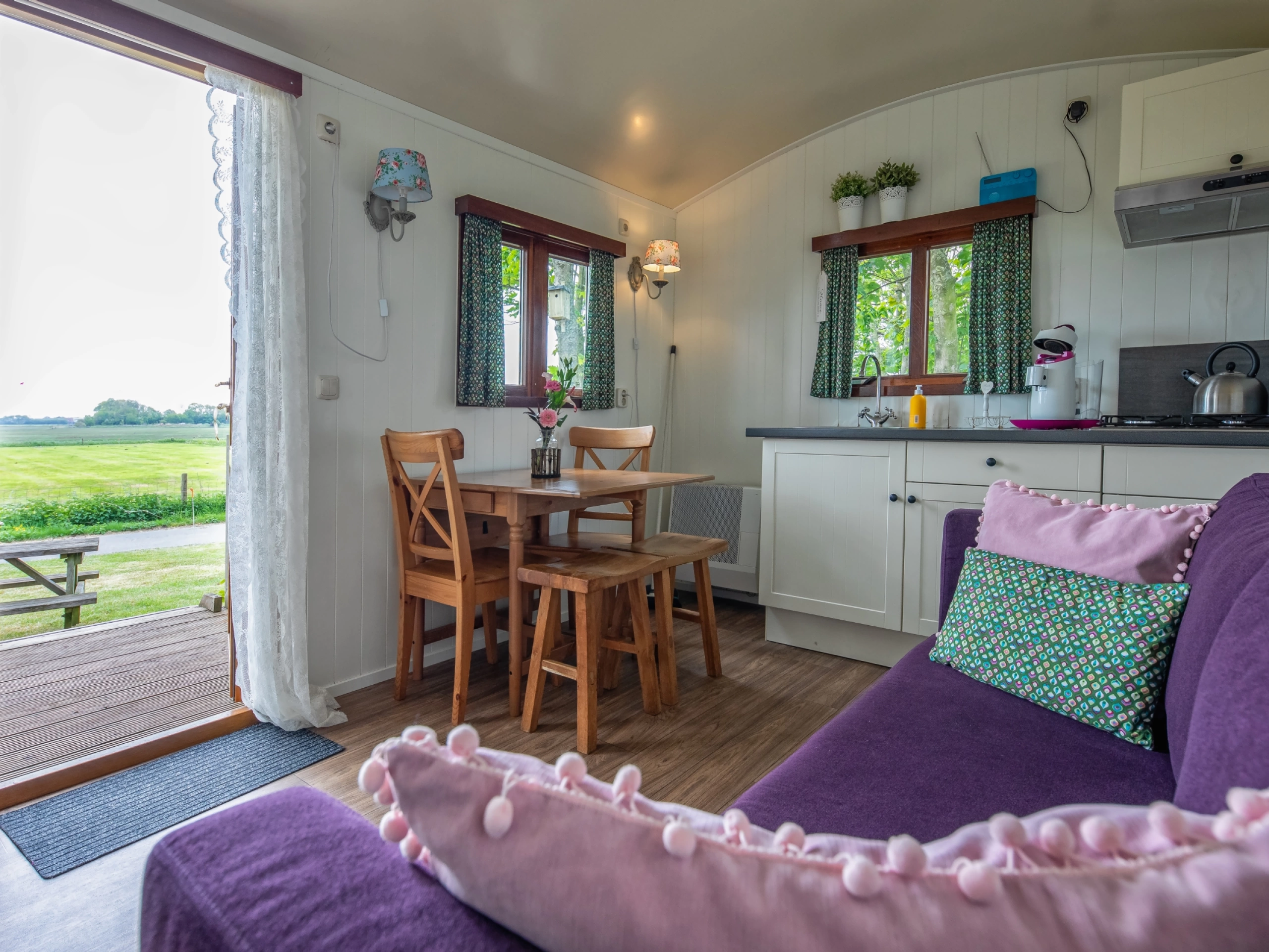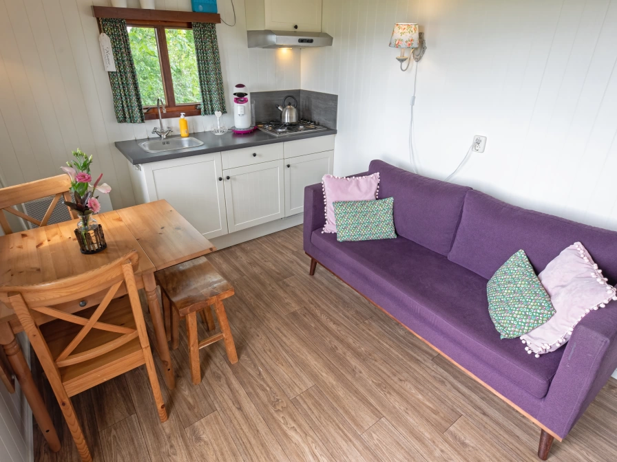 Der Zigeunerwagen befindet sich an einem privaten Ort im Garten. und bietet einen weiten Blick auf das Fischerdorf Oudeschild und die grasenden Kühe auf der Wiese. Das Wohnzimmer verfügt über einen Wohn- / Essbereich mit Tisch mit Stühlen und einem Sofa. Die Küche verfügt über einen Gasherd, Senseo, Kühlschrank und Spüle. Es gibt 2 Schrankbetten für 2 Personen. Das Badezimmer (neben dem Pipowagen) verfügt über ein Waschbecken, eine Dusche und eine Toilette. Dieser Zigeunerwagen verfügt über eine eigene Terrasse und einen Garten mit einem Picknicktisch.