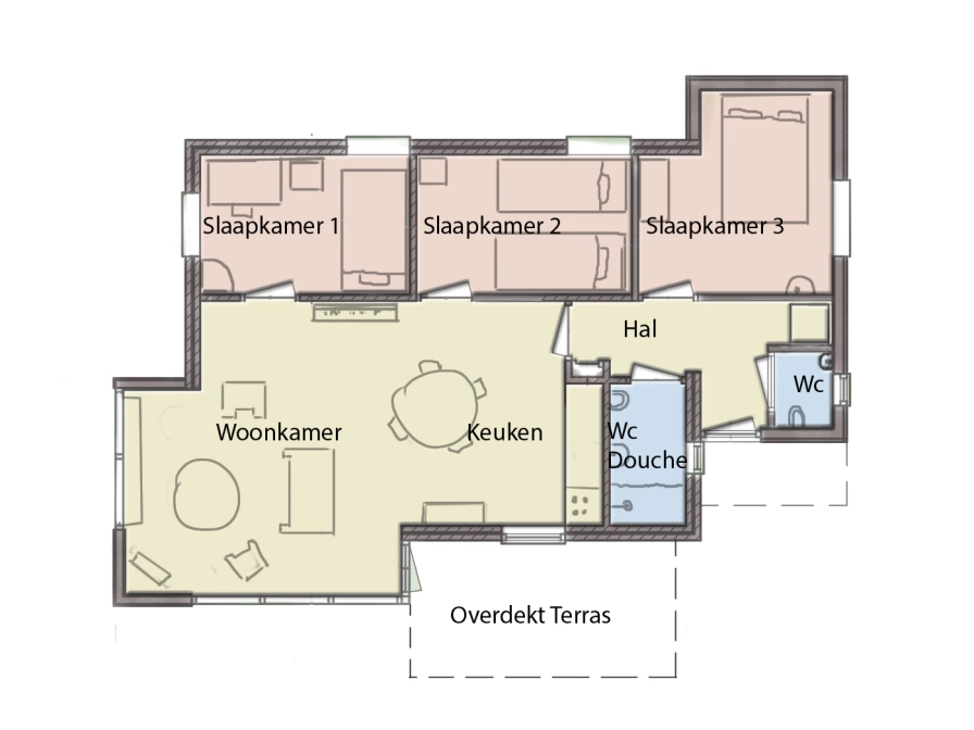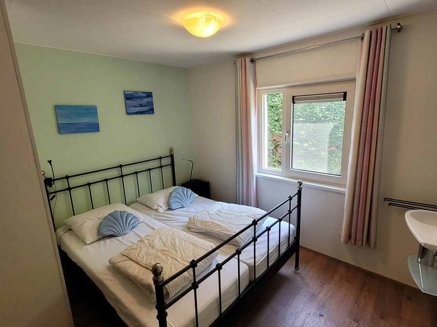 Das Wohnzimmer dieses freistehenden Bungalows verfügt über eine Sitzecke mit Smart-TV und einen Essbereich. Die offene Küche ist mit einem Kühlschrank mit Gefrierfach, Backofen, Mikrowelle und Geschirrspüler ausgestattet. Dort sind drei Schlafzimmer. Schlafzimmer 1 verfügt über ein Doppelbett mit separaten Matratzen (80 x 200) und ein Waschbecken. Schlafzimmer 2 verfügt über zwei Einzelbetten (80 x 200), die auch als Doppelbett kombiniert werden können. Das dritte Schlafzimmer hat ein Etagenbett (90 x 200; 90 x 190). Das Badezimmer verfügt über eine Dusche, ein Waschbecken und eine Toilette. Es gibt eine zweite Toilette in der Halle. Die Waschmaschine befindet sich ebenfalls in der Halle. Dieser Bungalow verfügt über einen großen, abgeschiedenen Garten mit einer überdachten Südterrasse. Gartenmöbel sind vorhanden.