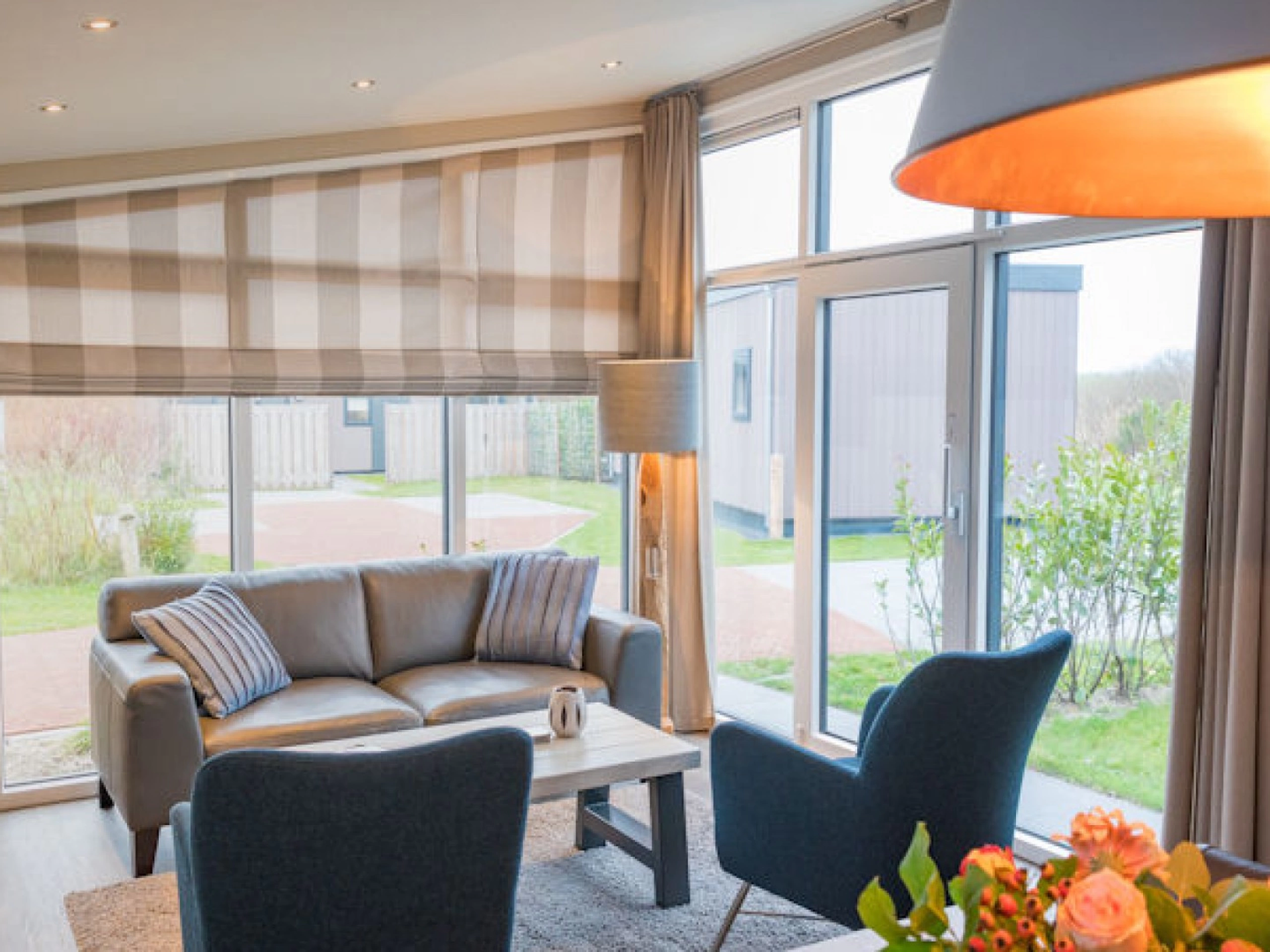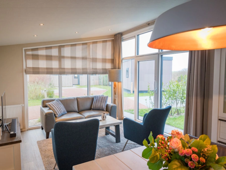 Das Wohnzimmer verfügt über einen Sitzbereich mit einem LCD-TV und einen Essbereich. Die offene Küche ist mit Kühl- / Gefrierschrank, Mikrowelle, Geschirrspüler, Toaster und Kaffeemaschine ausgestattet. Es gibt zwei Schlafzimmer mit jeweils zwei Boxspring-Betten. Das Badezimmer hat eine Dusche, Waschbecken und Toilette. Das Chalet verfügt über eine Terrasse. Gartenmöbel sind vorhanden.
