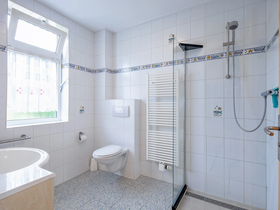 Das Wohnzimmer dieses freistehenden Ferienhauses verfügt über eine Sitzecke mit TV und einen Essbereich. Die offene Küche ist mit Kühlschrank, Gefrierschrank, Mikrowelle und Spülmaschine ausgestattet. Es gibt drei Schlafzimmer (eines im Erdgeschoss) mit jeweils zwei Einzelbetten. Das Badezimmer im Erdgeschoss verfügt über eine Dusche, WC und Waschbecken. Im Obergeschoss befinden sich zwei Schlafzimmer. Im Obergeschoss befindet sich ein separates WC. Dieses Haus hat einen schönen Garten mit Terrasse. Gartenmöbel sind vorhanden.