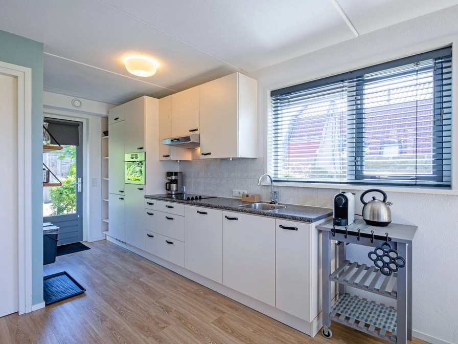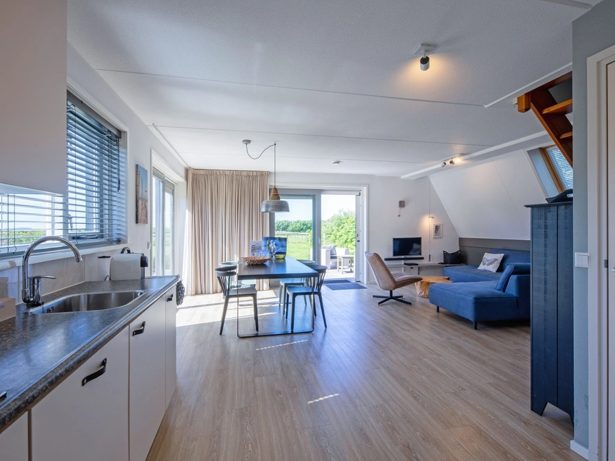 Das Wohnzimmer verfügt über eine Sitzecke mit TV, Musikanlage und Essbereich. Die offene Küche ist mit einem Kühlschrank, einem Gefrierschrank, einer Kombi-Mikrowelle, einem Geschirrspüler, einer Nespresso-Kaffeemaschine und einer Kaffeemaschine ausgestattet. Es gibt eine separate Toilette. Im Obergeschoss befinden sich zwei Schlafzimmer mit Fliegengittern: ein Schlafzimmer mit Doppelbett und ein Schlafzimmer mit zwei Einzelbetten. Das Badezimmer verfügt über eine Dusche, ein Waschbecken und eine Toilette. Dieses Ferienhaus verfügt über eine großzügige Terrasse mit Holzofen.