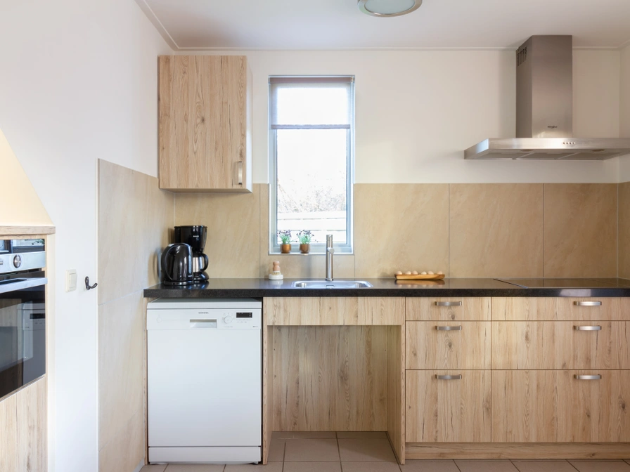 Das geräumige Ferienhaus ist barrierefrei mit 93 cm Türen. Das Erdgeschoss hat einen eigenen Eingang, der in eine Halle mit Treppen zum Obergeschoss, eine Toilette und Zugang zum Wohnzimmer mit offener Küche führt. Die Sitzecke verfügt über ein bequemes Sofa, Sessel und einen Fernseher. Im selben Raum befinden sich ein Essbereich für 6 Personen und eine offene Küche mit Schubladen, ein Induktionskochfeld und ein Thermostathahn mit Hebel, Geschirrspüler und Mikrowelle, Filterkaffeemaschine und Kessel. Vom Wohnzimmer aus befindet sich im Erdgeschoss ein Doppelzimmer mit einer Größe von 350 x 400 cm, einem Wendekreis von ca. 150 x 150 cm und zwei Pflegebetten. Es besteht eine direkte Verbindung vom Schlafzimmer zu den angepassten Sanitäranlagen. Das Badezimmer (250x250 cm) hat eine Dusche und es gibt ein Waschbecken (mit Thermostat) und eine erhöhte Toilette mit klappbaren Handläufen. Es gibt auch Griffe und Klappwandhocker, das Waschbecken ist für Rollstühle geeignet. Die beiden anderen Schlafzimmer befinden sich im ersten Stock und verfügen jeweils über zwei Einzelbetten und ein Waschbecken. Sie sind über eine sogenannte "faule" Treppe erreichbar, die mit Antirutsch und Geländer ausgestattet ist. In der Eingangshalle finden Sie eine zweite Toilette und die Treppe zum Obergeschoss. Das Ferienhaus verfügt über eine private Terrasse mit eigenen Möbeln, um die sich eine Hecke befindet. Der weitläufige Landschaftsparkplatz wird mit anderen Besuchern geteilt, das Spielfeld und die Ausrüstung sind auch für den allgemeinen Gebrauch.