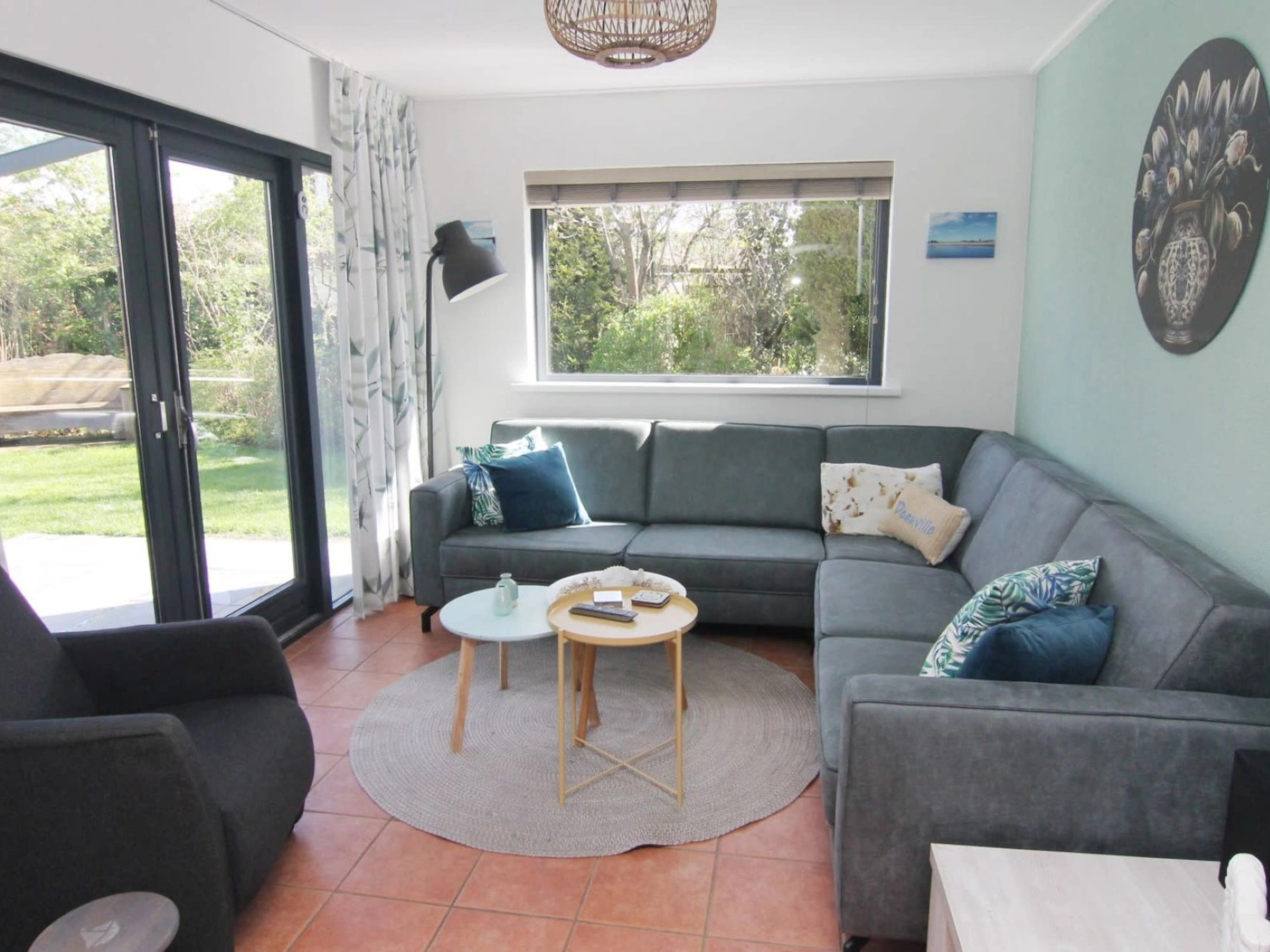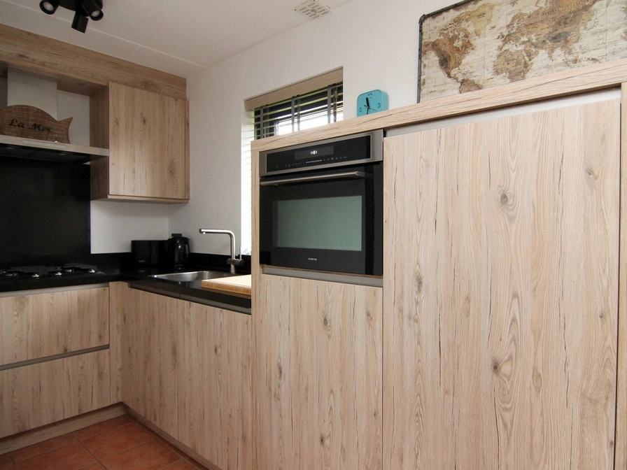 Das Wohnzimmer verfügt über einen Essbereich und eine Sitzecke mit Kamin und Fernseher. Die offene Küche ist mit Geschirrspüler, Mikrowelle, Kühlschrank und Kaffeemaschine ausgestattet. Es gibt ein Schlafzimmer mit zwei Einzelbetten. Das Badezimmer verfügt über Dusche, Waschbecken und WC. Im Obergeschoss befinden sich zwei weitere Schlafzimmer, jeweils mit zwei Einzelbetten. Dieser Bungalow bietet einen großzügigen Garten mit Terrasse. Gartenmöbel sind vorhanden.