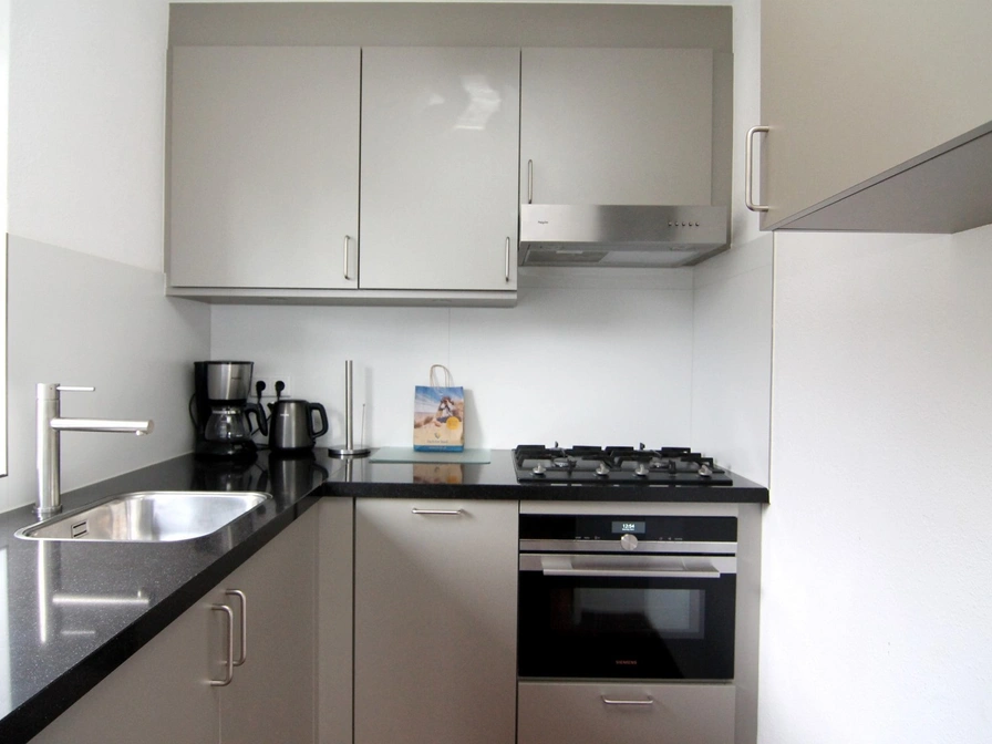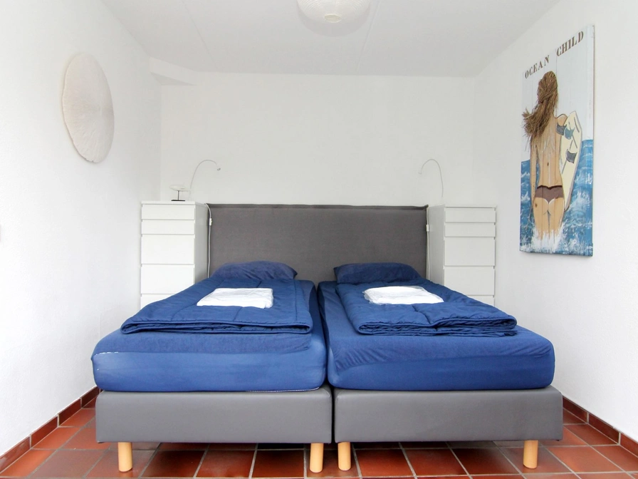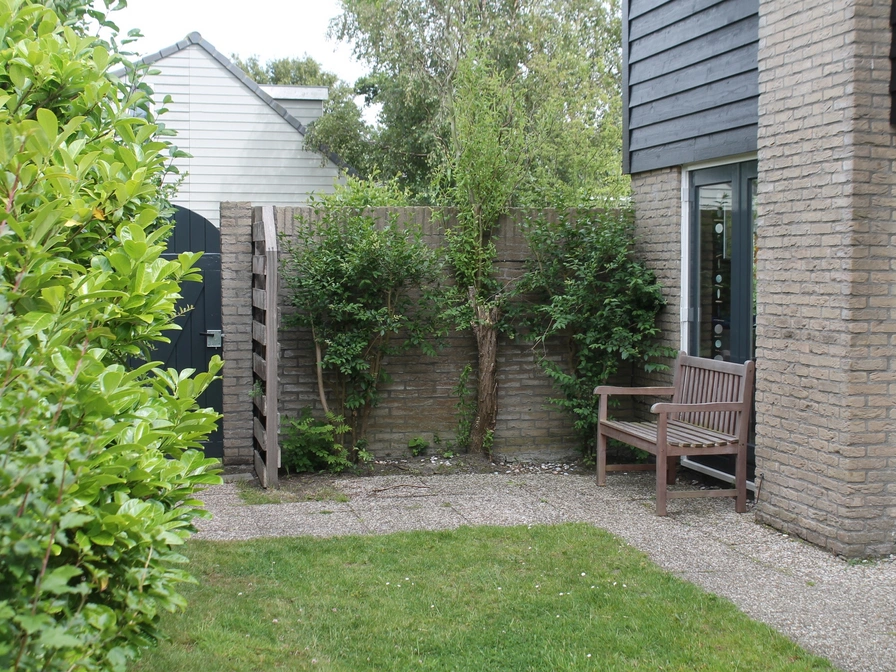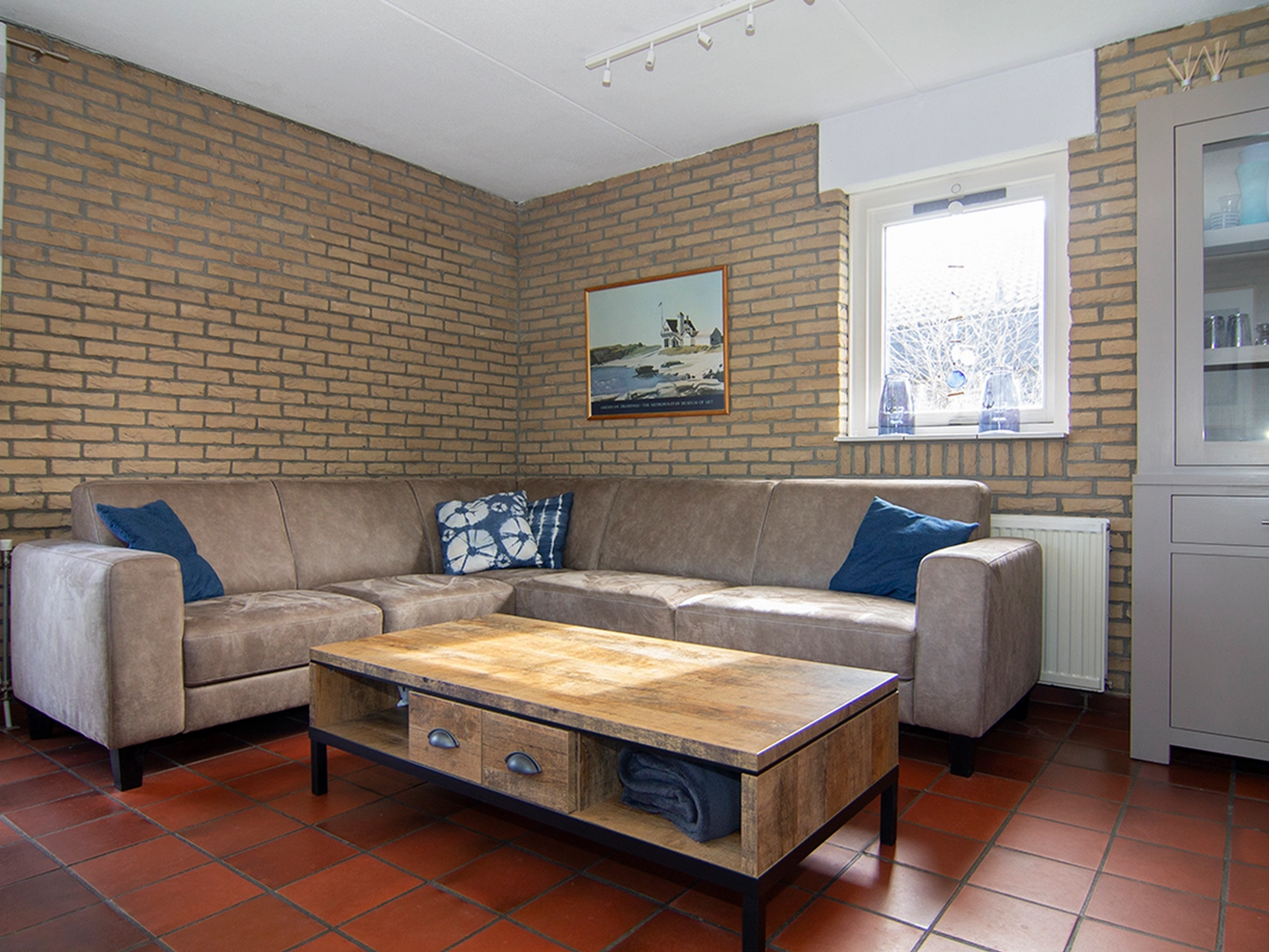 Eingang. Sie betreten ein gemütliches Wohnzimmer mit einer komfortablen Sitzecke inklusive Fernseher und einem geräumigen Essbereich. Die offene Küche ist komplett ausgestattet mit Geschirrspüler, Mikrowelle, Kühlschrank und Kaffeemaschine. Im Erdgeschoss befinden sich ein Schlafzimmer mit zwei Einzelbetten und ein Badezimmer mit Dusche, Waschbecken und WC. Im Obergeschoss befinden sich zwei weitere Schlafzimmer, jeweils mit zwei Einzelbetten. Draußen erwartet Sie ein großzügiger Garten mit Terrasse und Gartenmöbeln zum Entspannen.