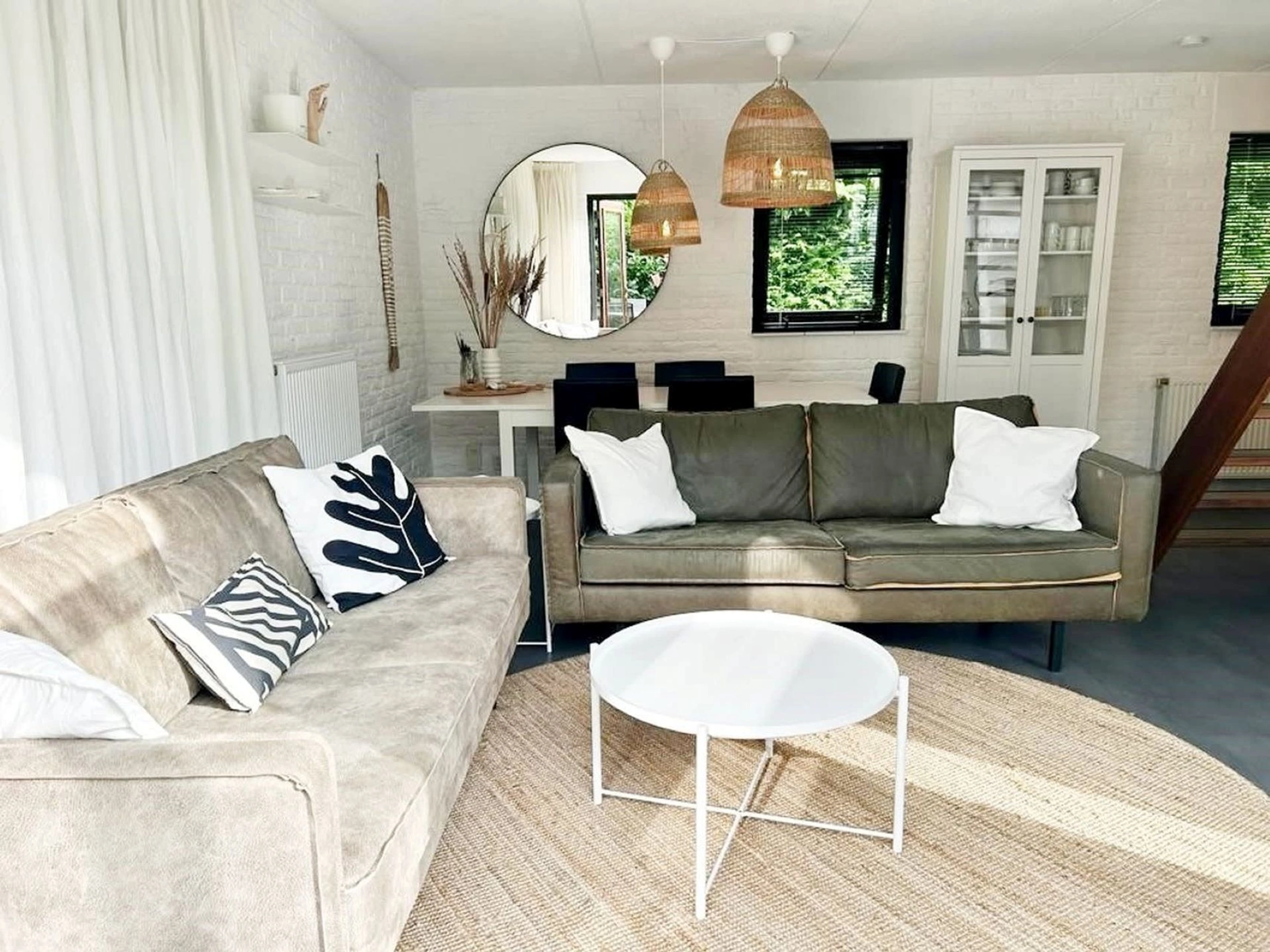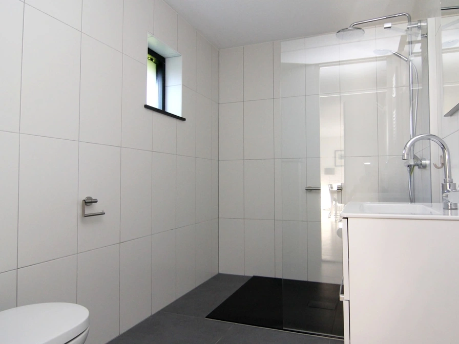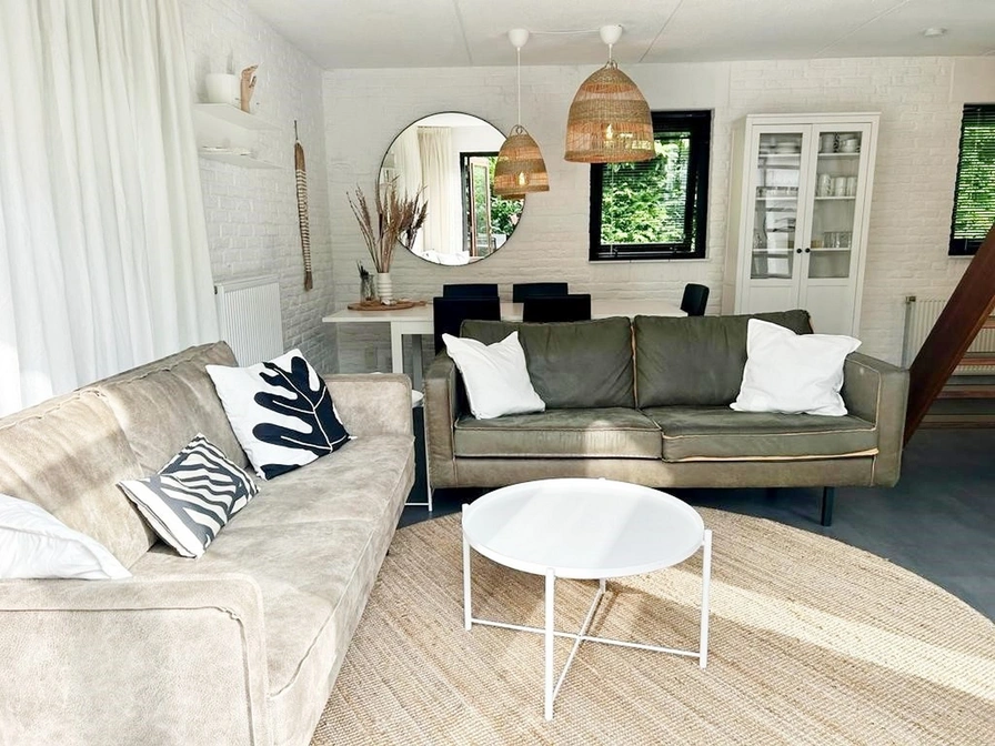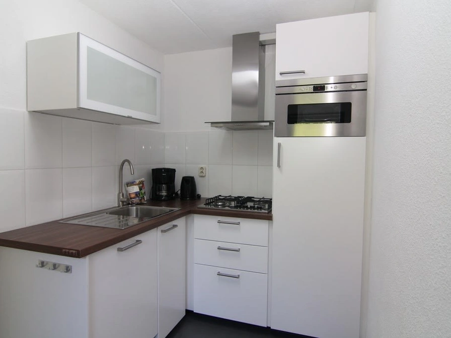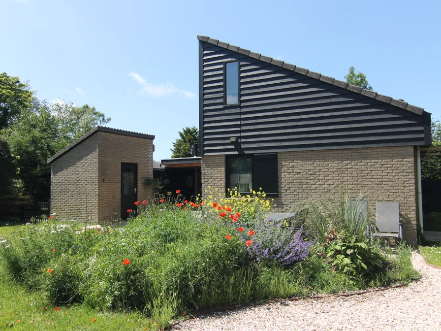 Eingang. Sie betreten ein gemütliches Wohnzimmer mit bequemer Sitzecke und Fernseher. Angrenzend befinden sich der Essbereich und die halboffene Küche mit Geschirrspüler, Mikrowelle und Kühlschrank. Im Erdgeschoss dieses freistehenden Ferienhauses finden Sie ein Schlafzimmer mit zwei Einzelbetten und ein Badezimmer mit Dusche, Waschbecken und WC. Im Obergeschoss befinden sich zwei weitere Schlafzimmer, jeweils mit zwei Einzelbetten. Sie haben Zugang zu einem großzügigen Garten mit Terrasse und Gartenmöbeln. Ein kleiner Fahrradschuppen ist ebenfalls vorhanden.
