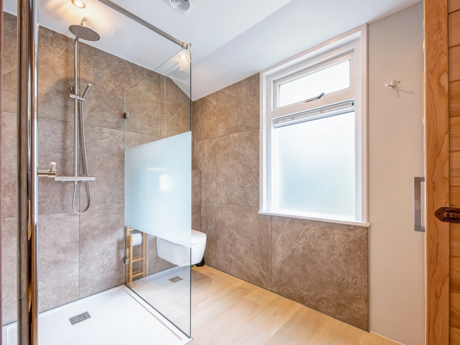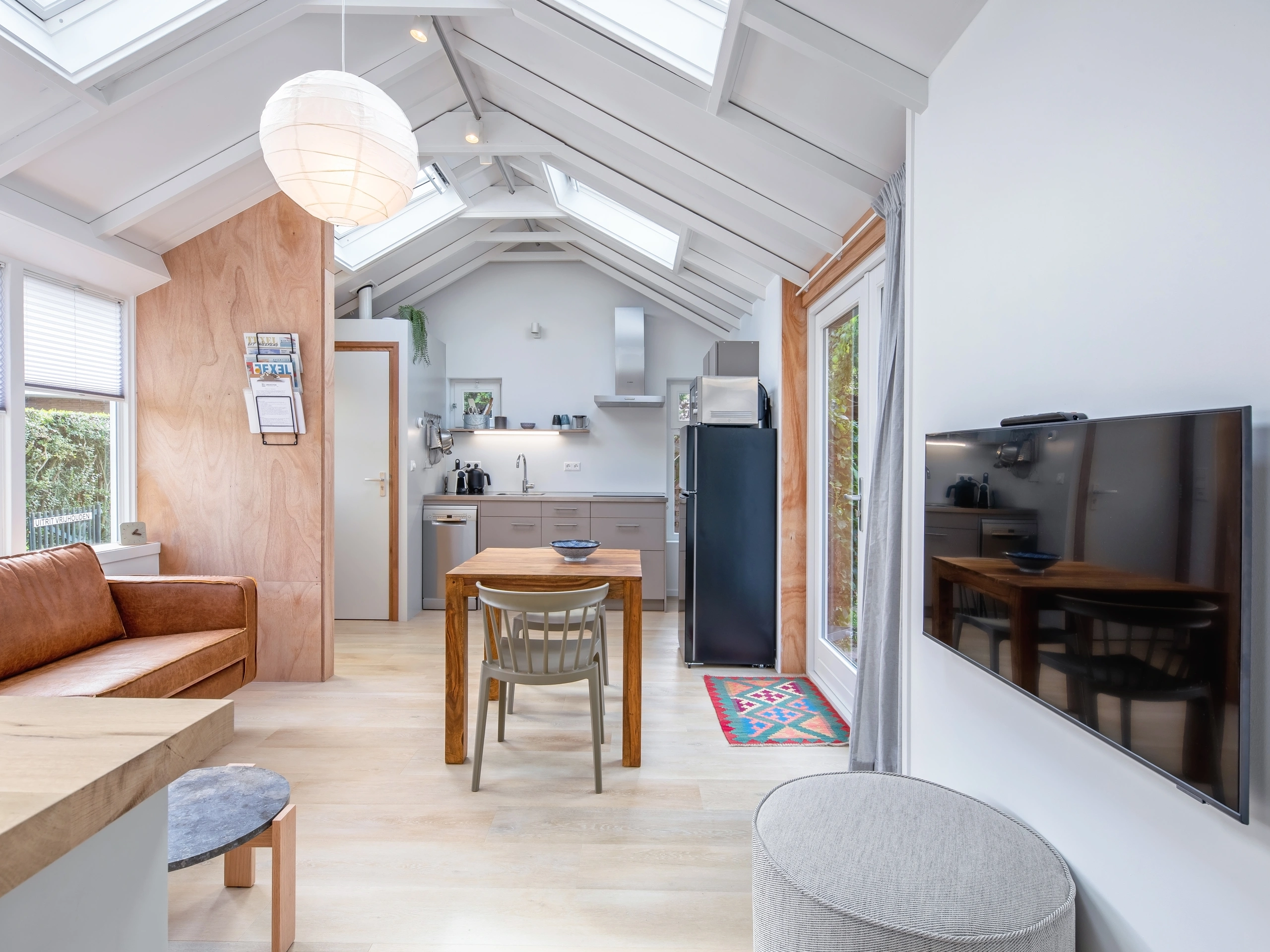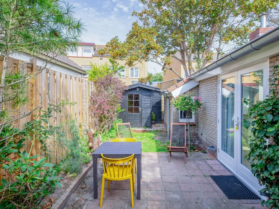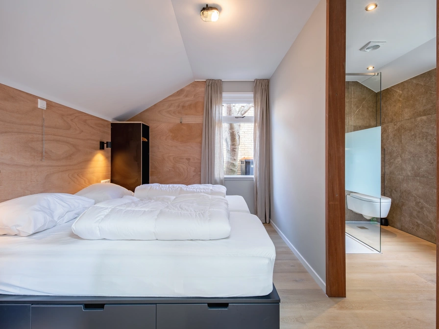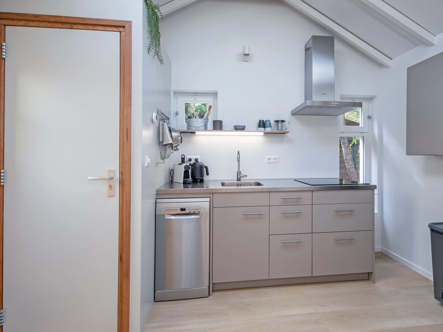 The cottage has a living room with a two-seater sofa, dining table and Smart TV and an open kitchen with 4 induction hobs, a Nespresso, toaster, combination microwave and a fridge with freezer. The separate bedroom has a double bed (two single mattresses) and an 'en-suite' bathroom with sink, toilet and a walk-in shower with rain shower. Everything on one floor. Through French doors you reach your terrace with seating and parasol and a private enclosed garden (approximately 40m2).