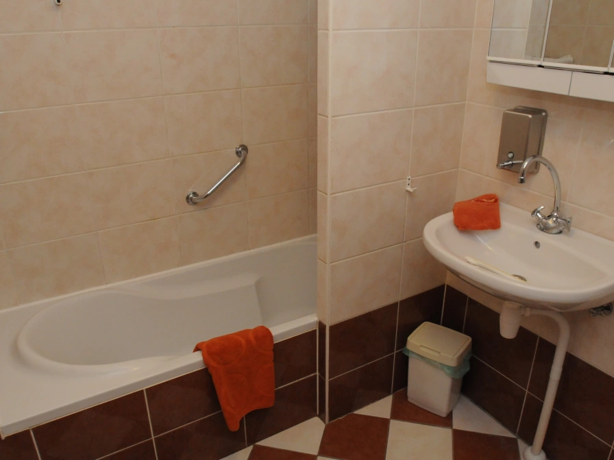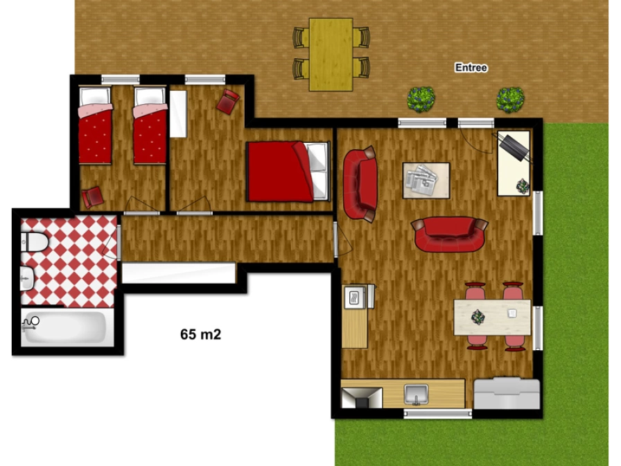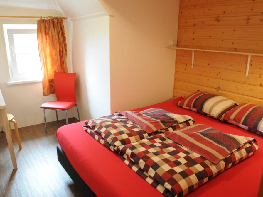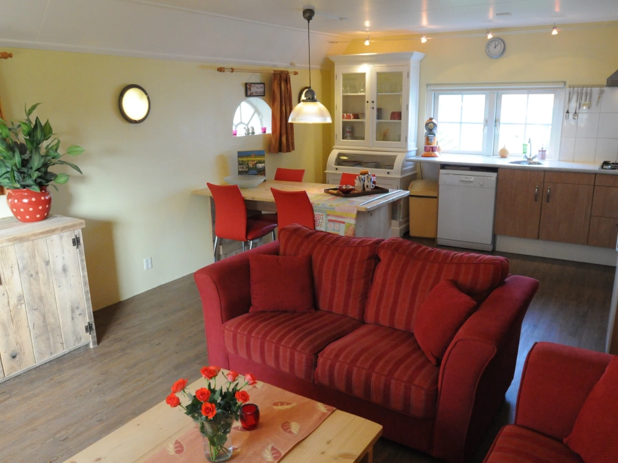 Apartment red is located in the bell jar. The living room has a sitting area with TV and a dining area. The open kitchen is equipped with a refrigerator with freezer, dishwasher, microwave, kettle and Senseo. There are bedrooms, one of which has a double box-spring bed. The other bedroom has 2 single box-spring beds. The bathroom has a bath, sink and toilet. The apartment has a terrace.