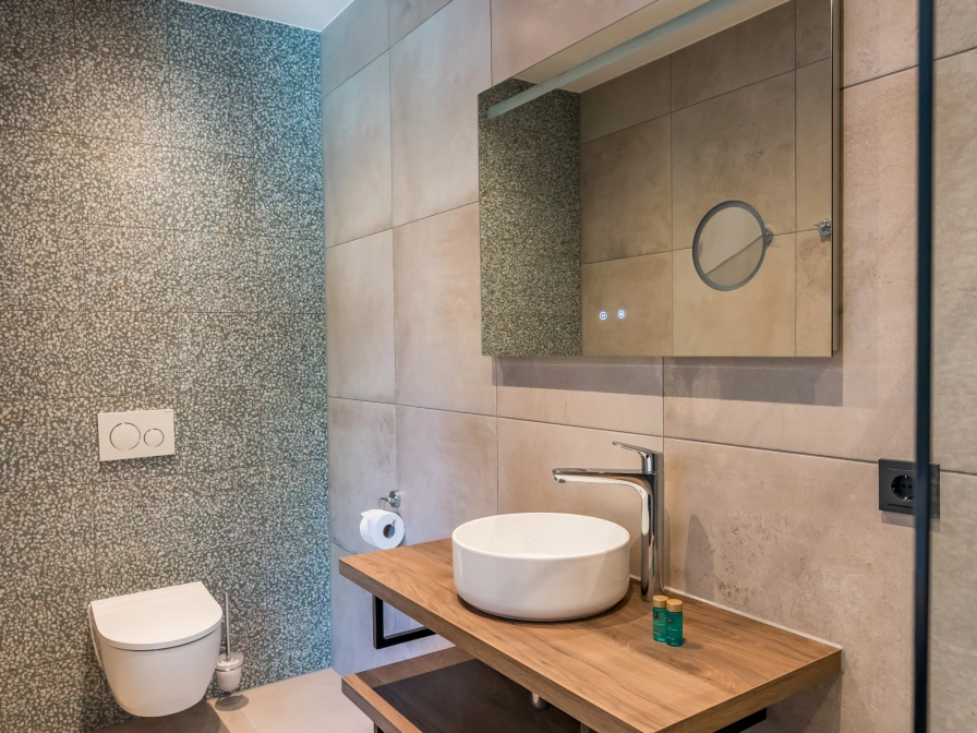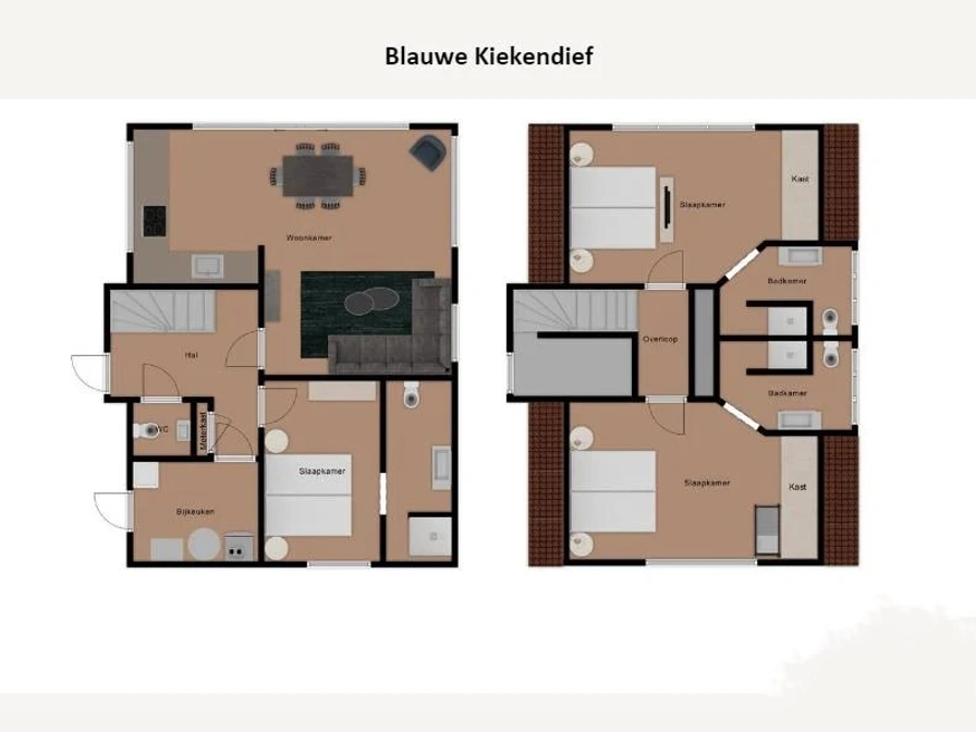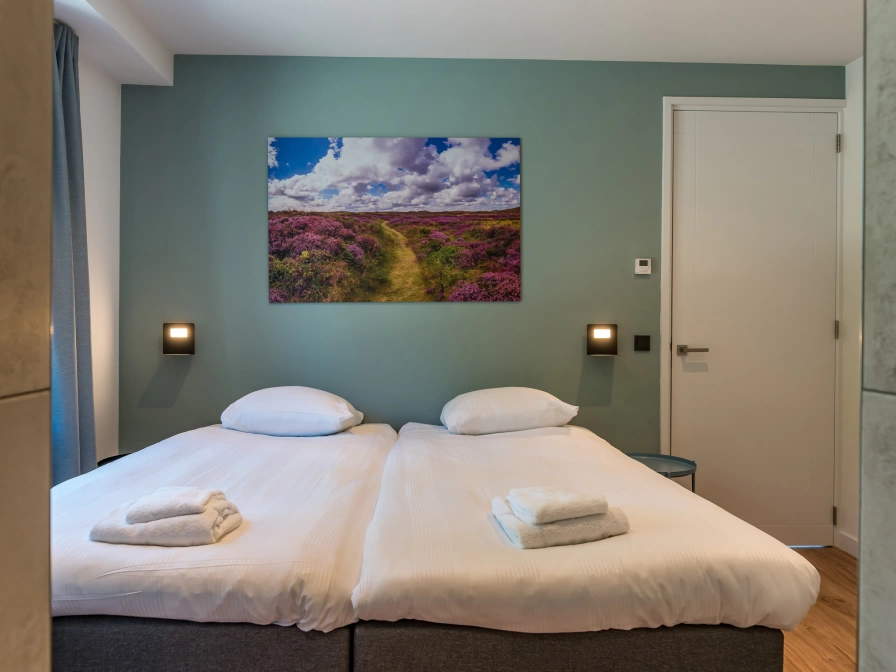 Through the hall, where the toilet is, you enter the spacious living room with a comfortable sitting area with flat screen TV and a dining area. The open kitchen is fully equipped and includes a dishwasher, combination microwave, Nespresso equipment, filter coffee maker, kettle, toaster, juicer and refrigerator with freezer. You cook on induction. The bedroom on the ground floor has two extra-long single box-spring beds (90x210) and a smart TV. Next is the bathroom with a walk-in rain shower with sun shower XL. On the first floor are two bedrooms, each with two extra long single box-spring beds (90x210), each with its own bathroom with a massage shower and toilet. The total living space is one hundred square meters. The spacious garden has a terrace with garden furniture and parasol.