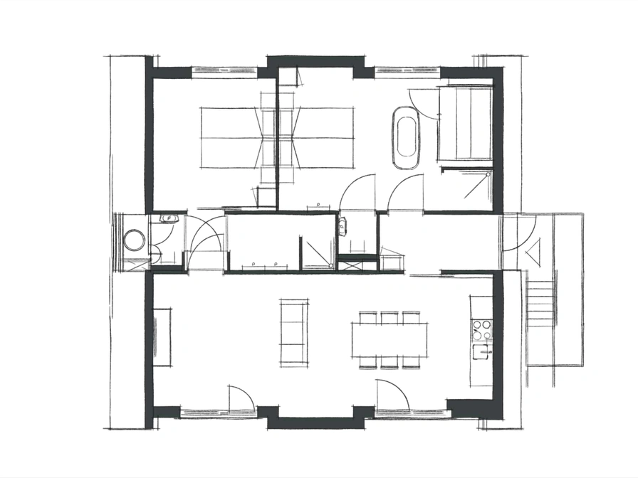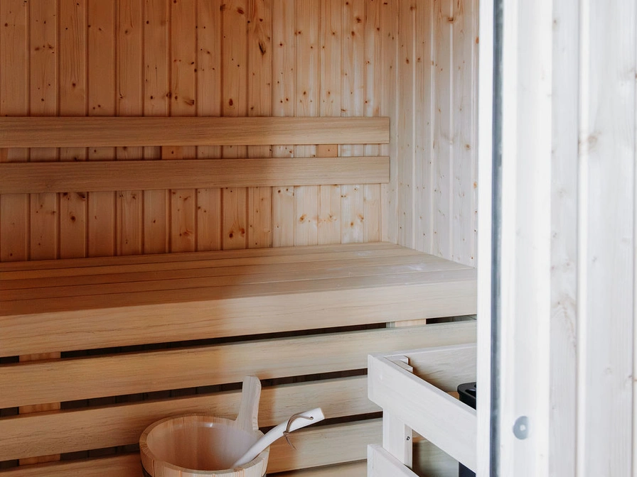 This 2-room apartment is located on the second floor. The living room is cozily furnished with a dining and sitting area, and the fully equipped kitchen offers everything you need for a comfortable stay. The master bedroom with its own sauna and a freestanding bath, perfect for a moment of pure relaxation. The second bedroom offers two comfortable single beds. The apartment will have a balcony in the autumn, where you can enjoy the view of the garden.