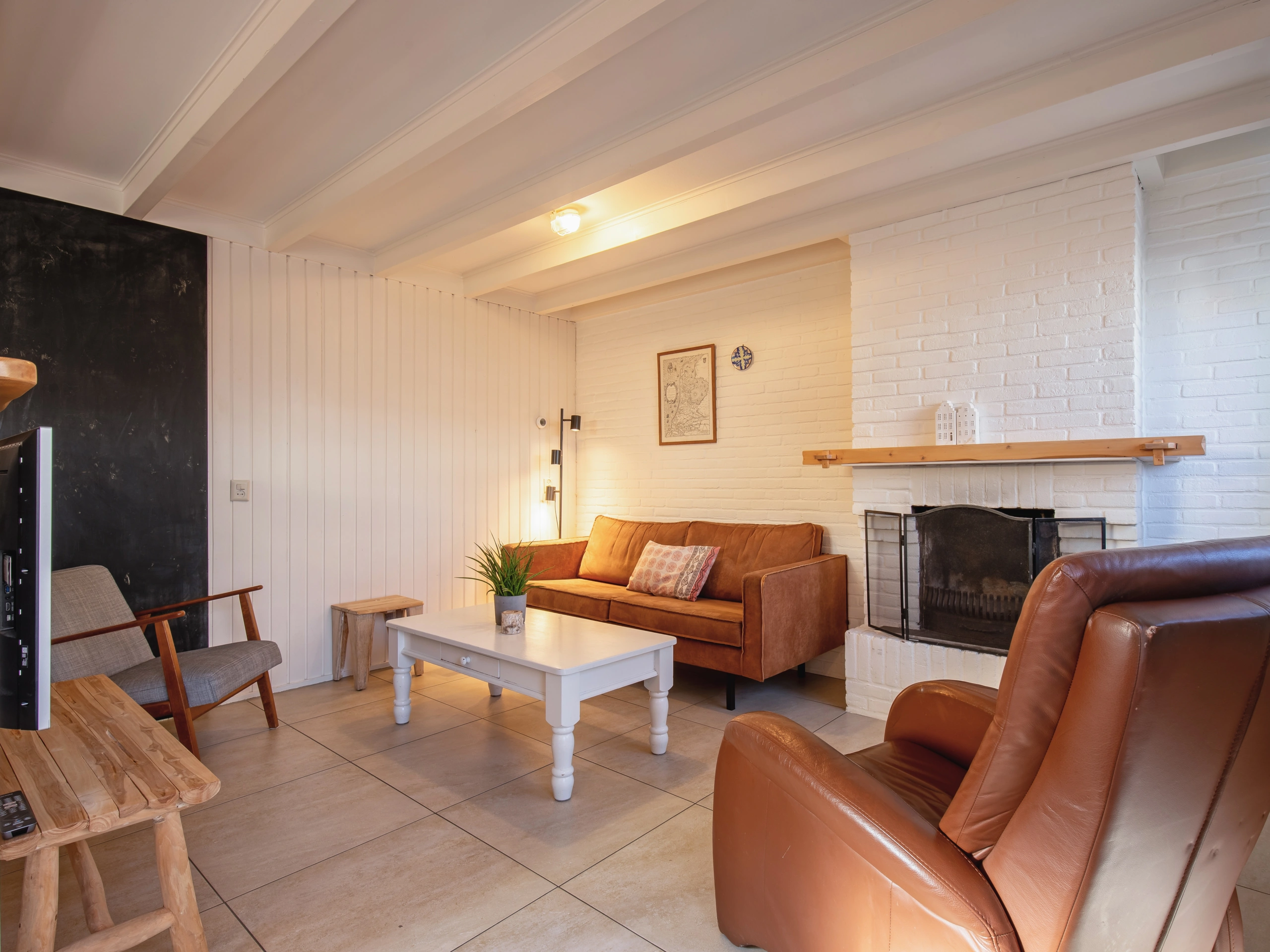 The living room has a sitting area with fireplace and a smart TV. The open kitchen is equipped with a dishwasher, fridge with freezer, microwave, a Nespresso and a coffee maker. The bathroom has a shower, sink and toilet. There is a washing machine in the indoor storage room. On the upper floor there are two bedrooms with 2 single box-spring beds each. Holiday home Pollux has a south-facing terrace and parking space for one car per booking.