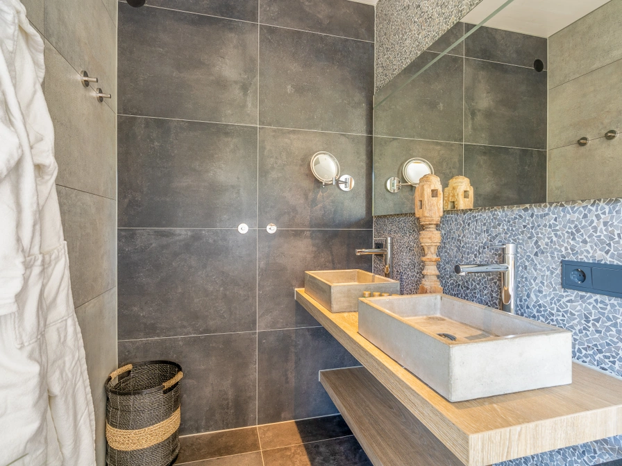 Through the entrance you enter the spacious living room with sitting area, fireplace, smart TV and music system. The open kitchen is fully equipped with a refrigerator, freezer, dishwasher, integrated coffee maker, Nespresso machine, Quooker, steam oven and combination microwave/oven. The bedroom on the ground floor has 2 single box-spring beds, a TV and a private bathroom with walk-in shower and sink. There is a separate toilet. On the first floor are the second and third bedrooms, each with 2 single box-spring beds, TV and a private bathroom ensuite with walk-in shower, bath and sink. Both bedrooms have a separate toilet. From the living room you enter through the wide, French doors on the spacious terrace with garden furniture and outdoor kitchen with Big Green Egg. The terrace faces south.