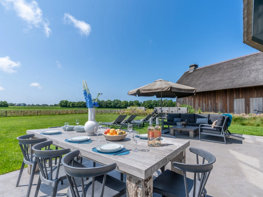 Through the entrance you enter the spacious living room with sitting area, fireplace, smart TV and music system. The open kitchen is fully equipped with a refrigerator, freezer, dishwasher, integrated coffee maker, Nespresso machine, Quooker, steam oven and combination microwave/oven. The bedroom on the ground floor has 2 single box-spring beds, a TV and a private bathroom with walk-in shower and sink. There is a separate toilet. On the first floor are the second and third bedrooms, each with 2 single box-spring beds, TV and a private ensuite bathroom with walk-in shower, bath and sink. Both bedrooms have a separate toilet. From the living room you enter the spacious terrace with garden furniture, outdoor kitchen with Big Green Egg and wood-fired hot tub through the wide, patio doors. The terrace faces south. The garden is fenced, partly with a fence and partly with a natural "Texel garden wall".