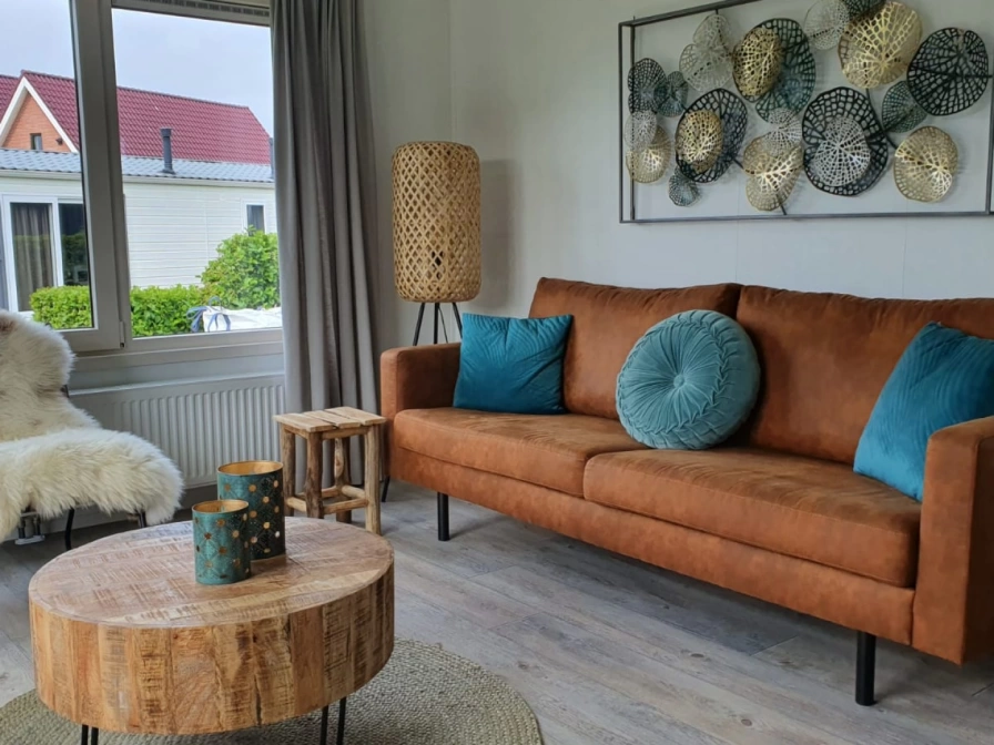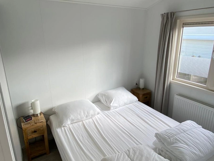 The chalet is stylish and fully furnished, with a comfortable seating area. 1 bedroom with 2x1 pers. beds that are pushed together. The 2nd bedroom has a bunk bed and 1x 1 pers. bed. The bathroom has a nice shower and toilet. There is a garden house with a canopy on the spacious, sunny terrace. A garden screen provides shelter and privacy. Under the canopy there is a large corner sofa and lounge chairs.
