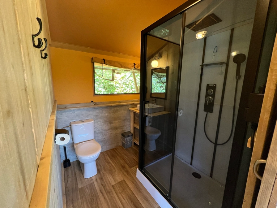 The front area of the lodge consists of a sitting area with TV and a dining area. The open kitchen is equipped with a 4-burner gas hob, a large fridge with freezer, coffee maker and kettle. There is a sleeping area with a double bed (2 mattresses together 160 x 200) and a sleeping area with a single bed and a bunk bed. The bathroom has a sink, toilet and rain shower. Under the covered veranda is a lounge set. There is a pellet stove, wireless internet and a safe.