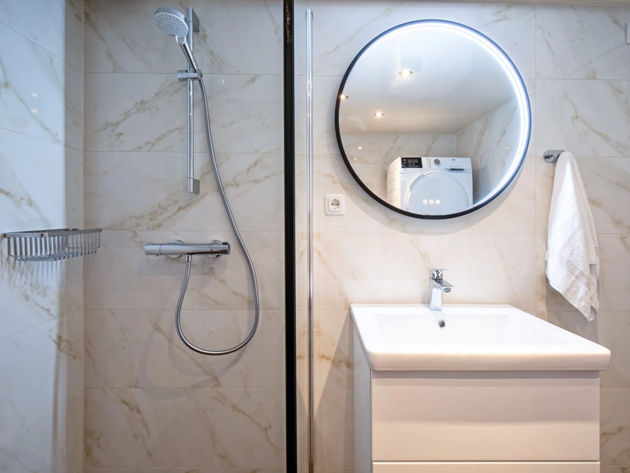 The spacious apartment is located on the ground floor, with a spacious terrace on the street side. The living room has a sitting area with smart TV and a dining area. The open kitchen has a dishwasher, combination microwave and coffee maker. A bedroom with 2 single box-spring beds on the street side. A bedroom with 2 single box-spring beds, without a window. The bathroom has a toilet, bath, shower and sink. Washing machine and dryer in the bathroom.