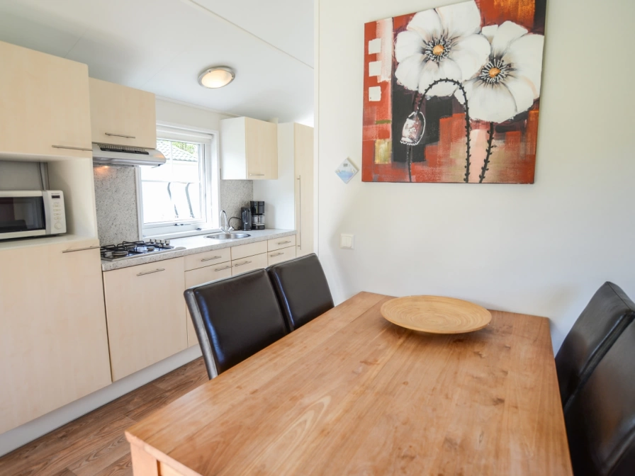 Chalet type E has an entrance, cozy living room with sitting area, dining area and smart TV with apps such as Netflix. The open kitchen has a dishwasher, microwave, coffee maker and kettle. One bedroom has two single beds (80x200, with 2 duvets 140x200). The second bedroom has a single bed and a bunk bed (80x200, duvets 140x200). In the bathroom you will find the shower, sink and toilet. Terrace with garden furniture and a bicycle shelter.