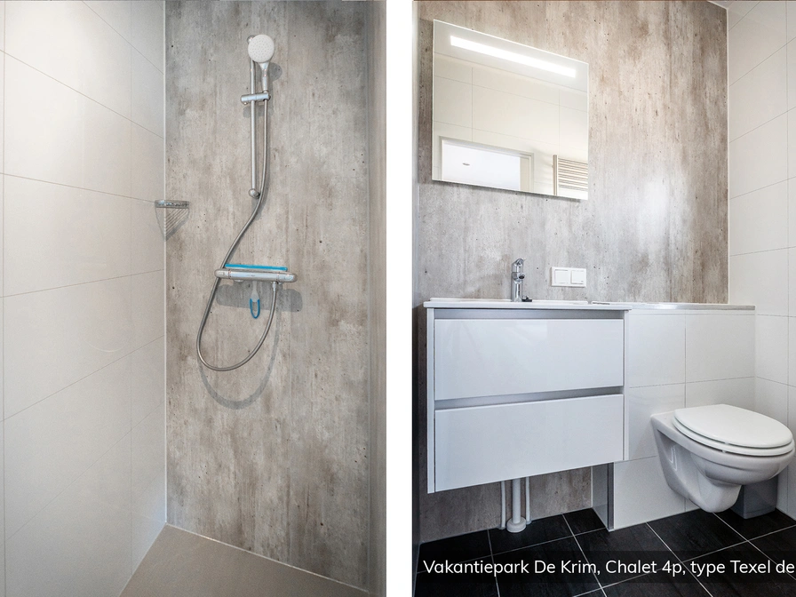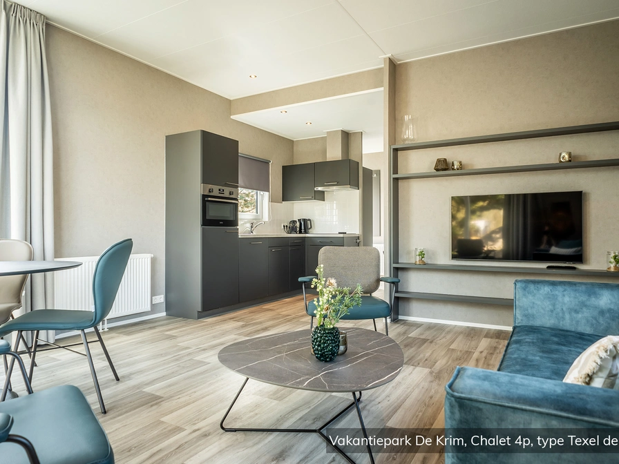 This modern chalet (Texel de luxe type) is centrally located in the park, near the facilities. The chalet has 2 spacious bedrooms, each with its own shower and toilet. The chalet also features an infrared sauna. The living room has a large sliding door and a sitting area with Smart TV. The open kitchen is equipped with a microwave, refrigerator and dishwasher. The chalet has a paved terrace and private parking.