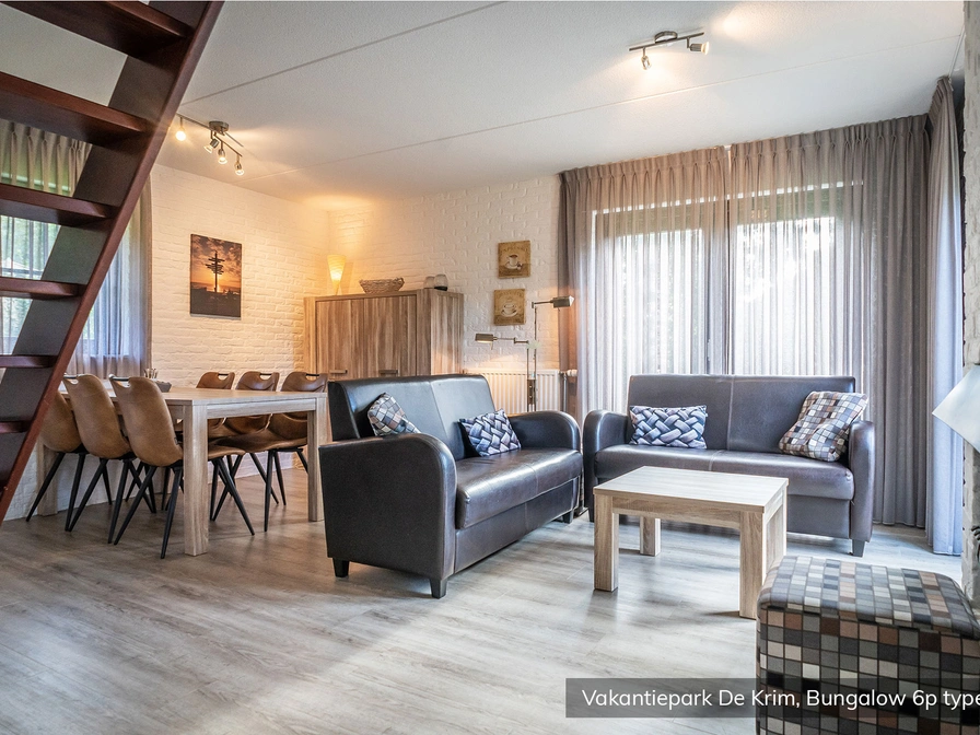 The detached bungalows of type C are spread throughout the park. The living room has a sitting area with fireplace and TV. Next to the dining area is the semi-open kitchen, equipped with a dishwasher, microwave and refrigerator. There is a bedroom with two single beds downstairs. The bathroom has a shower, sink and toilet. On the upper floor there are two bedrooms with two single beds each. This bungalow has a large garden with terrace. Garden furniture and a small bicycle shed are available.