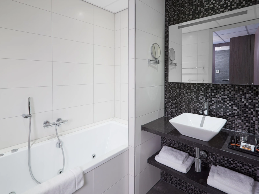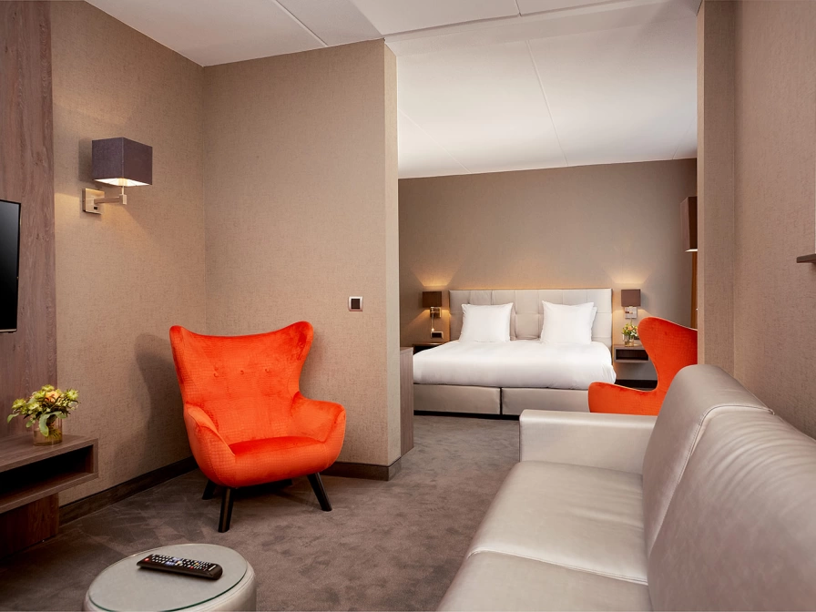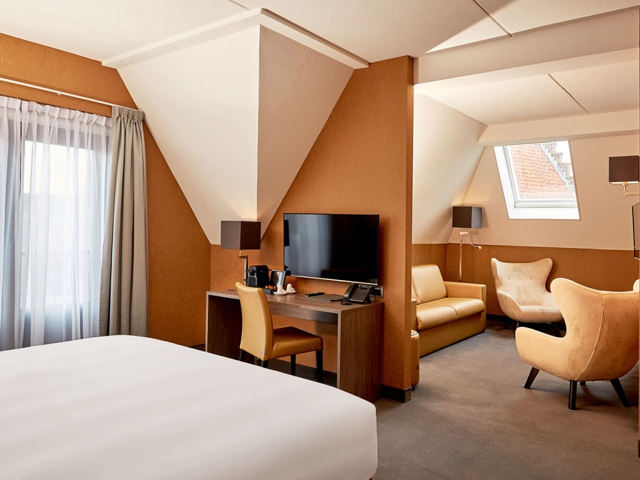 The Deluxe Suite is equipped with 2 single box-spring beds and a TV. There is a lounge area with a sofa bed and a second TV. A Nespresso is available. The spacious bathroom has a whirlpool bath, separate shower and toilet. The comfortable suite has a French balcony.