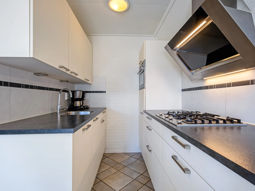 The living room of this detached holiday home has a sitting area with TV and a dining area. The open kitchen is equipped with a combi microwave, fridge with freezer compartment and dishwasher. There is a bedroom with 2 single beds. The bathroom has a sink and shower. The toilet is separate. On the upper floor are two bedrooms, each with 2 single beds. Upstairs is a second toilet. This holiday home has a terrace with garden furniture.