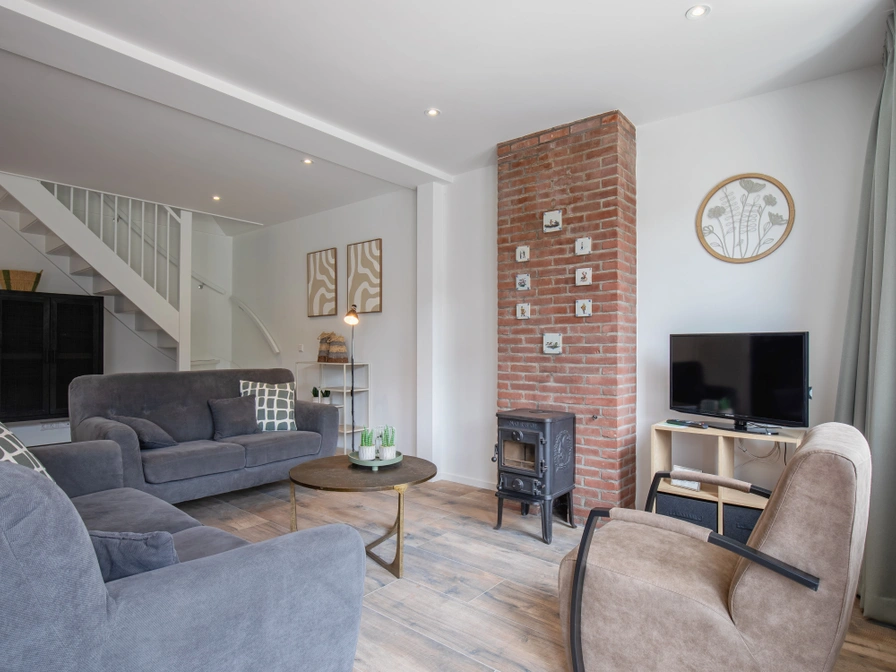 Entrance, living room with sitting area, dining table, and TV. Kitchen equipped with a filter coffee maker, refrigerator with freezer, dishwasher, induction cooktop, toaster, and more. On the ground floor is the first bedroom with a double bed. The bathroom has a shower, daybed, toilet, and double sink. Upstairs, there are two more bedrooms, each with two single beds, and a second bathroom with a shower, toilet, and sink. There is a lovely garden with a terrace and garden furniture.
