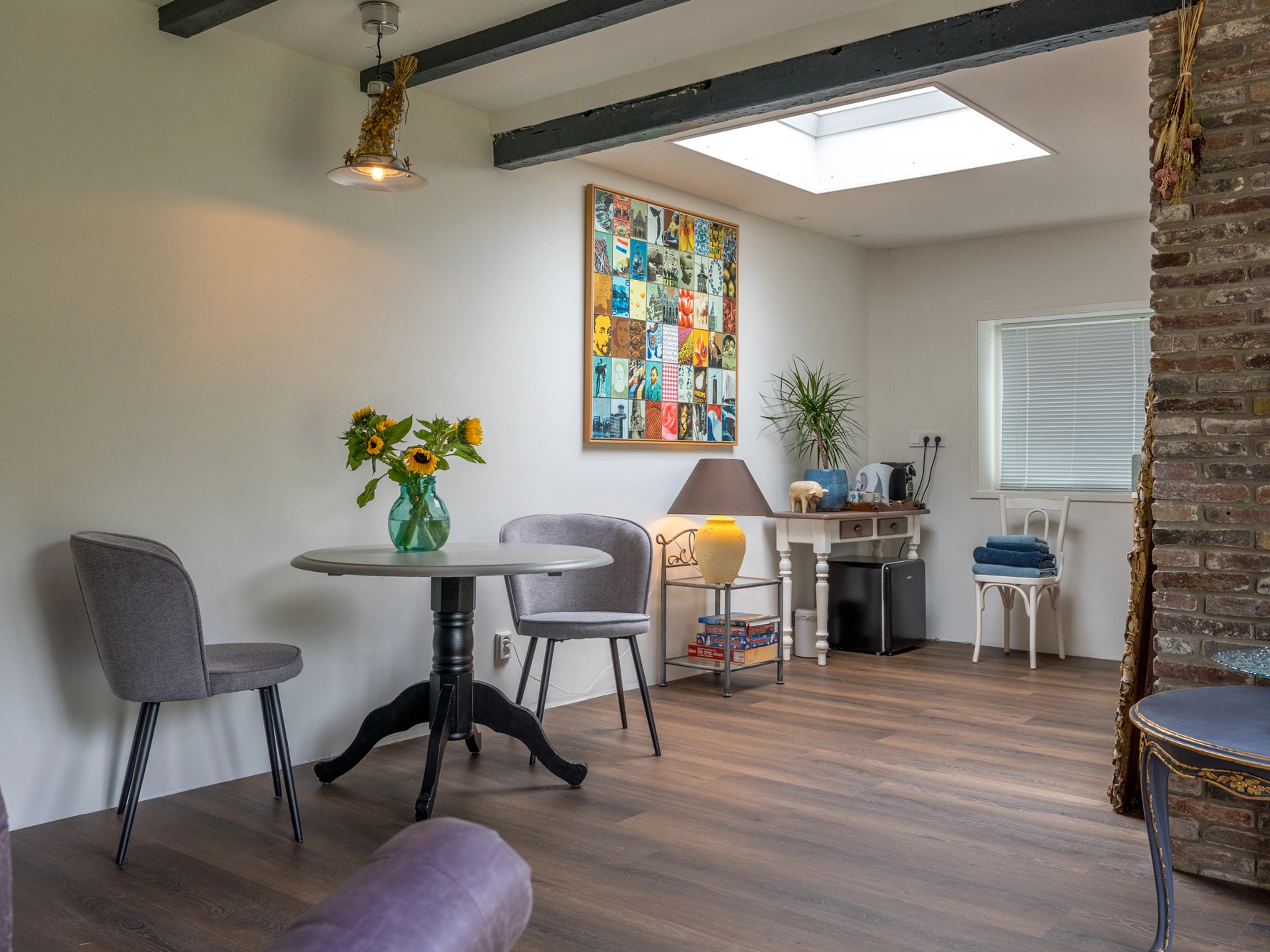 The garden room 'Ooi' is located on the ground floor. You have your own entrance from the garden. The living room has a cozy breakfast area, a sitting area and a coffee corner with a Nespresso coffee machine, kettle and a fridge. The bedroom is spacious and has a box spring bed (180 x 200 cm). Your bathroom has a rain shower and a floating toilet. the sink placed in outside the bathroom. You have a terrace with seating in front of the room. B&B De Oude Skuur has a large garden that you can use - together with the owner and the possible occupant of the other room.