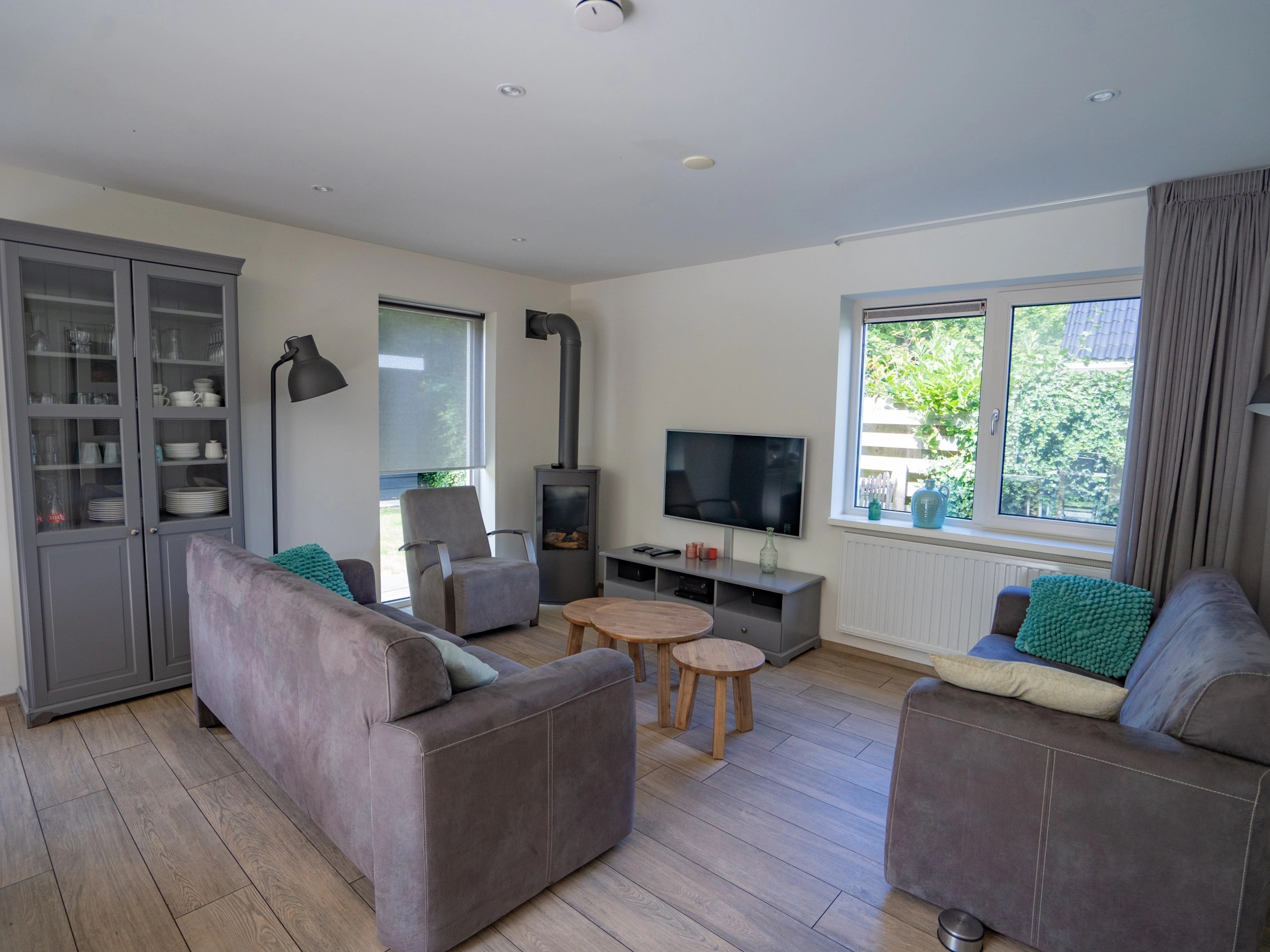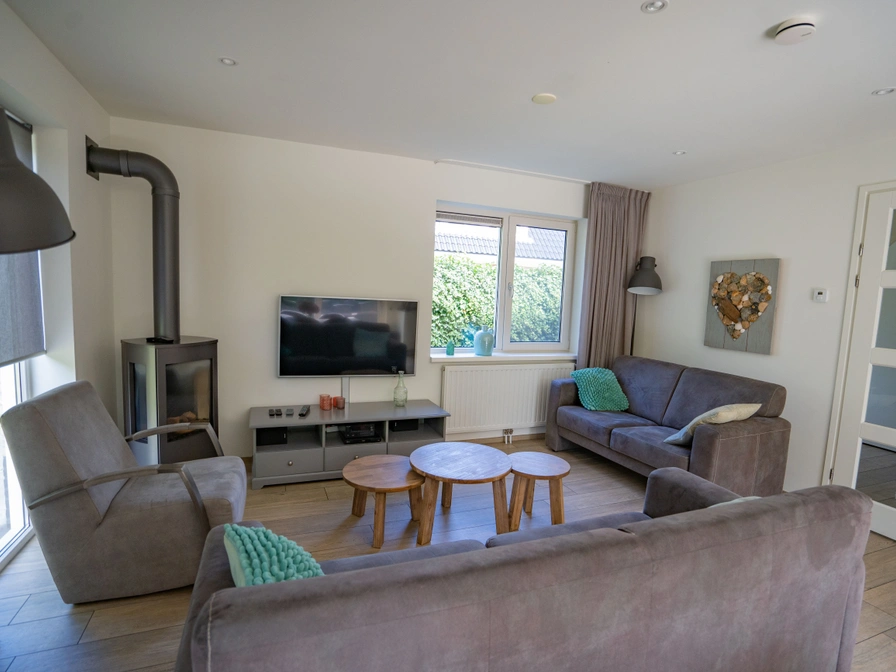 The living room of this luxuriously furnished, detached holiday home has a dining area and sitting area with a gas fireplace, TV, DVD player and stereo. The open kitchen is equipped with a refrigerator with freezer, 4-burner hob, coffee maker, combination microwave and dishwasher. There is a bedroom with 2 single beds. The bathroom has a walk-in rain shower and sink. The toilet is separate. Upstairs are two bedrooms, each with 2 single beds. The second bathroom has a bath, rain shower and double sink. The toilet is separate. This holiday home has a large, enclosed garden with a south-facing terrace. Garden furniture is available.