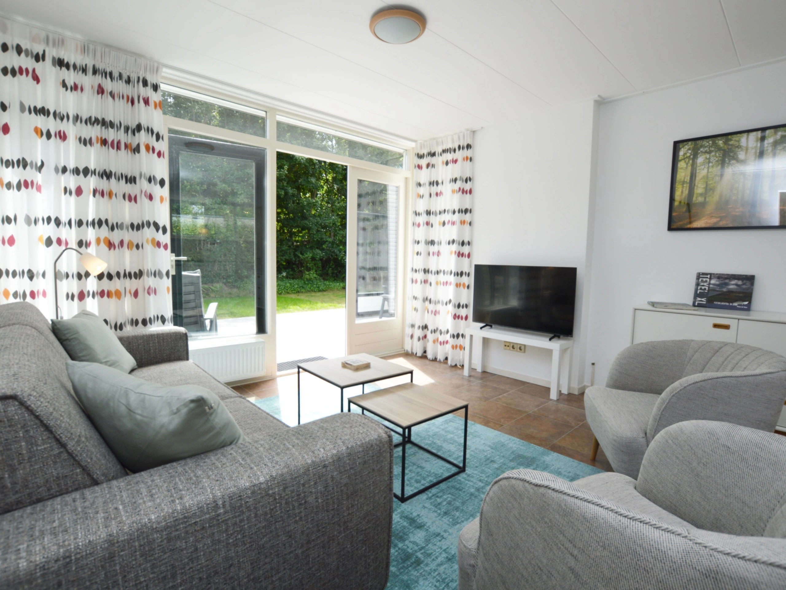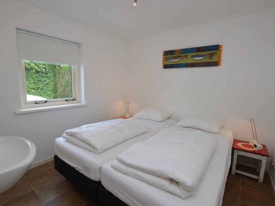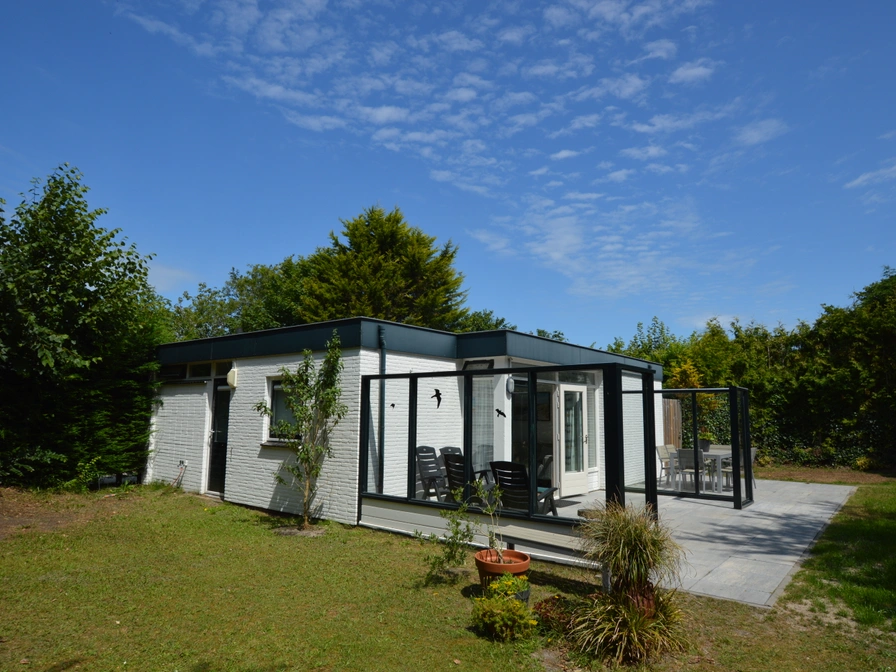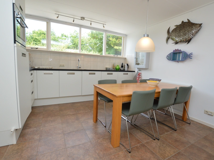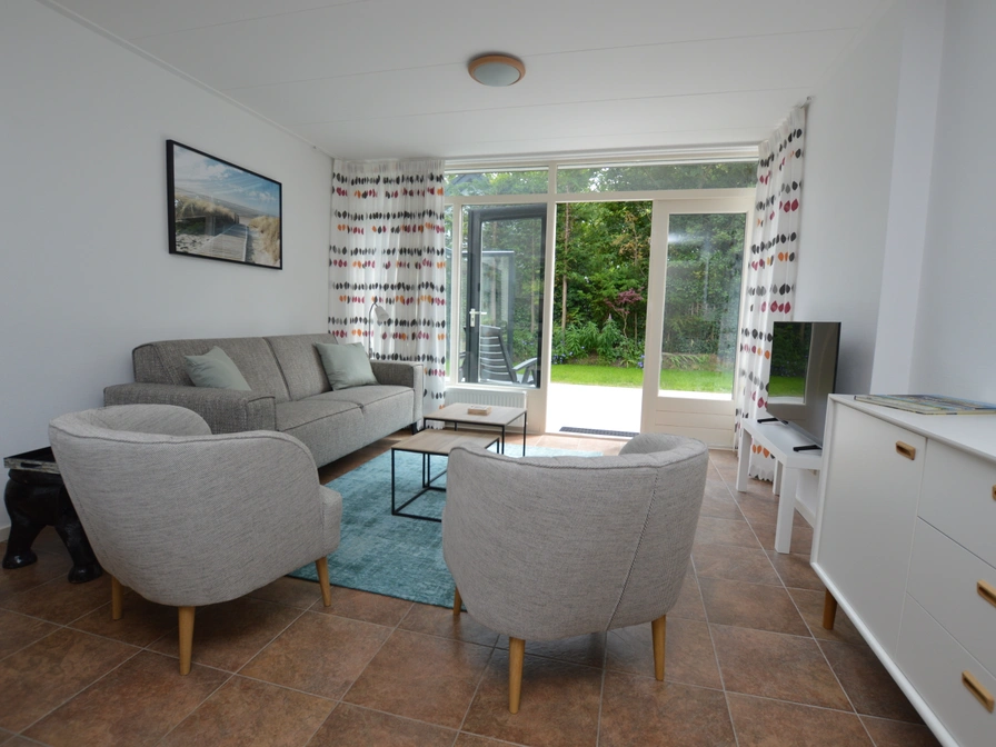 The bungalow has three bedrooms, two with two single beds and the third bedroom has a single bed (there are a total of five single duvets). One of the double bedrooms has a sink and both double bedrooms have a built-in wardrobe. The spacious open kitchen is equipped with a dishwasher, combi-microwave and large fridge with freezer compartment. The cosily furnished living room has a smart television and the bungalow has a wireless internet connection and a washing machine. The bathroom has a shower cabin, a sink and a toilet. The garden with large terrace and bicycle shed faces south and there is ample parking for two cars right next to the bungalow.