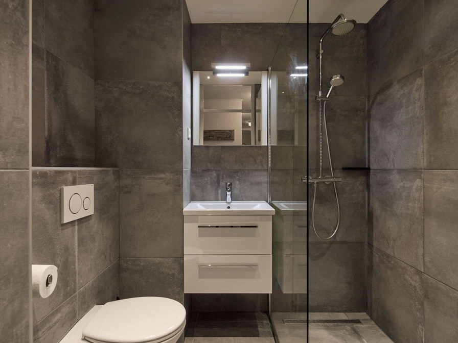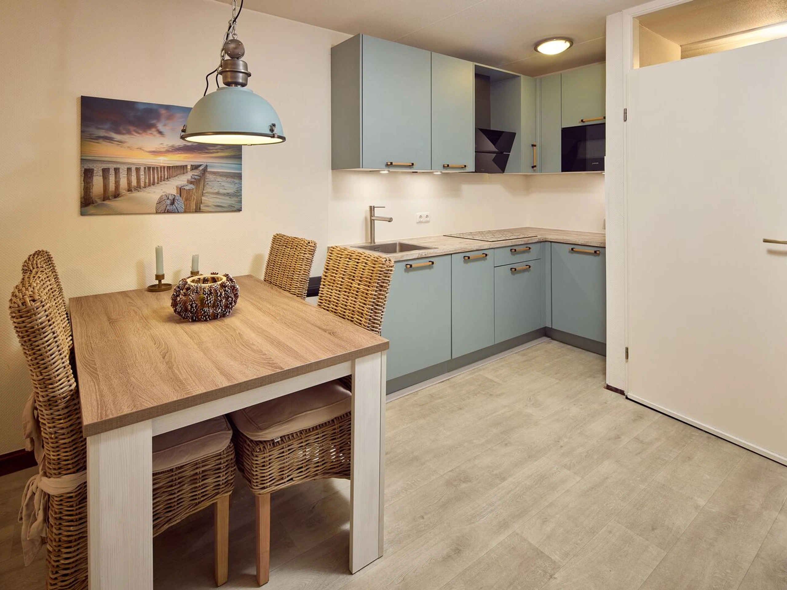 The cozy living room has a sitting area with a flat screen TV and telephone. The open kitchen is equipped with various equipment. There is also a dining area. There is a bedroom. The bathroom has a shower and toilet. This apartment has a terrace or balcony.