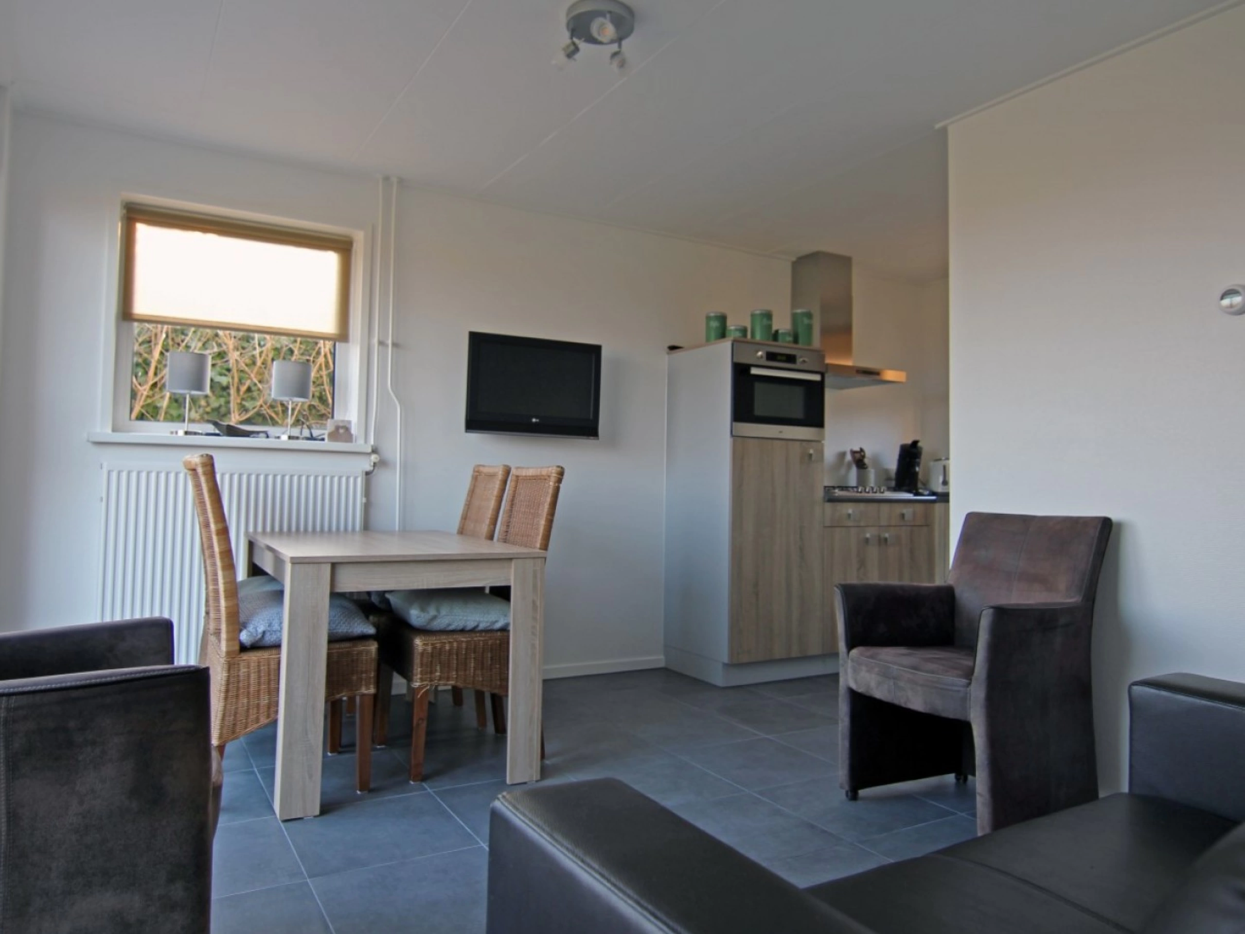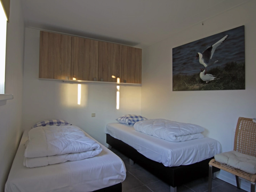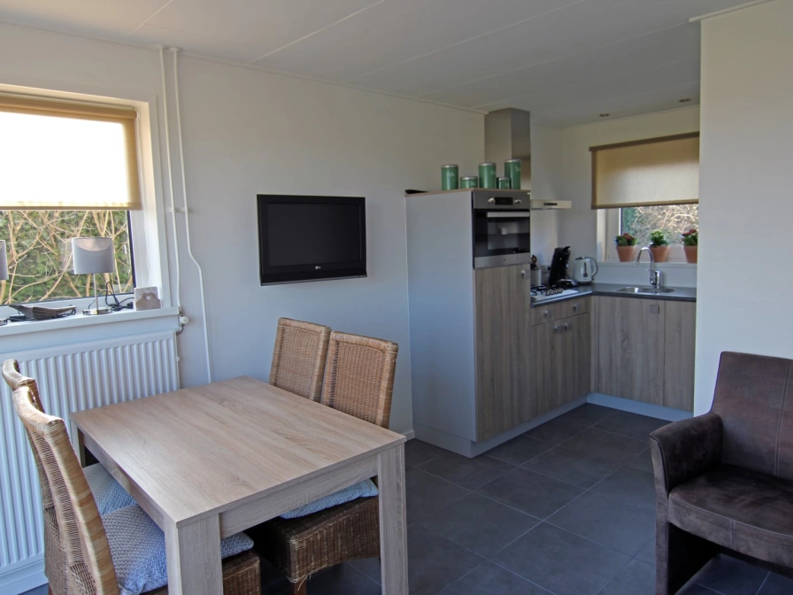 The bungalow for four people has two double rooms with single beds, central heating, sliding doors to a spacious garden, cable TV, microwave and full kitchen. The bungalow has a simple shower and toilet and each bedroom has its own sink. You have a nice view of the Roggesloot, which runs behind the garden.